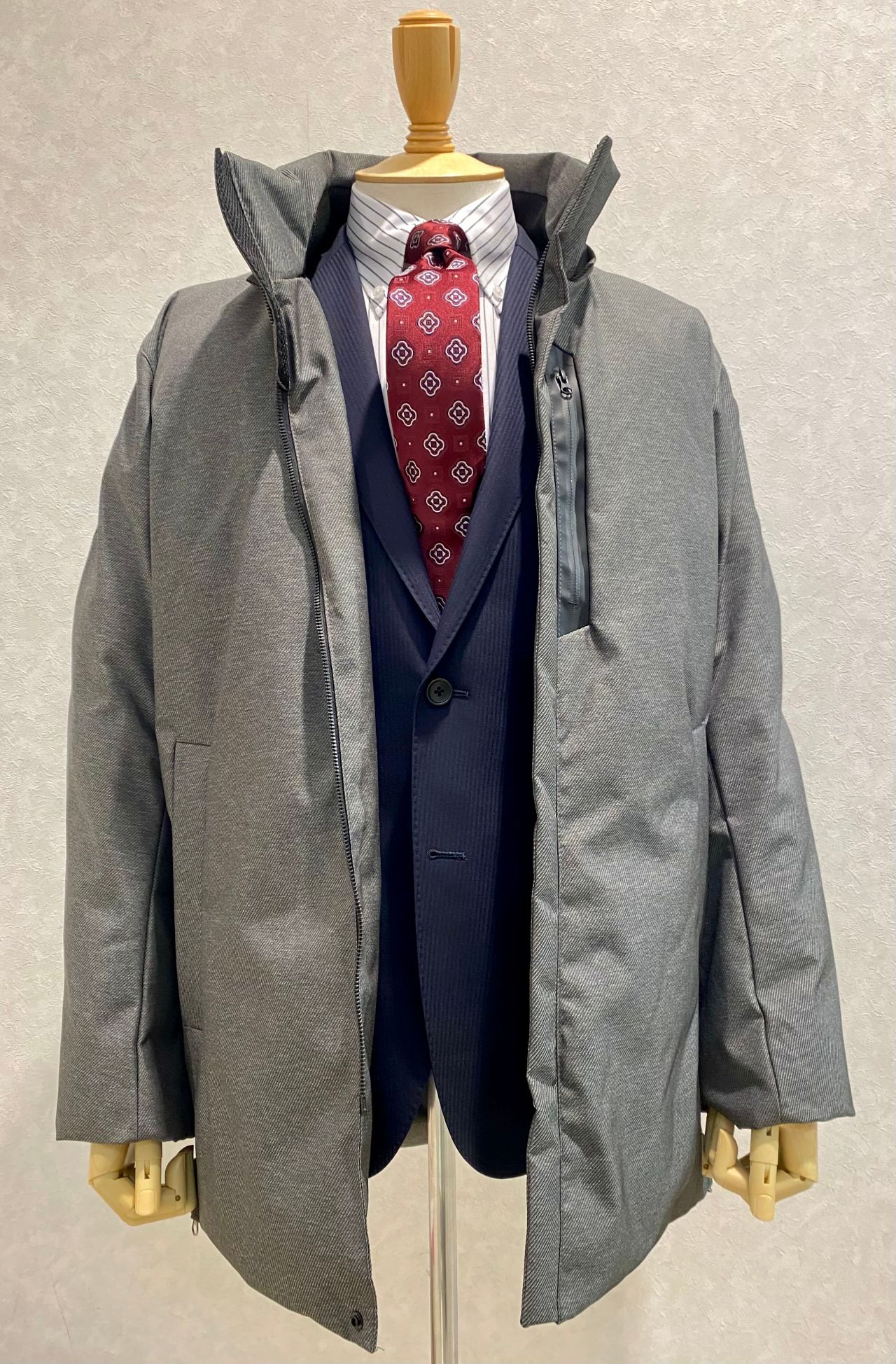表面の生地は撥水加工を施しており、水や汚れ、風も防いでくれますので、天気を気にせずに使っていただけます。さらにフードは、ファスナーで取り外しができますので、カジュアルだけでなくスーツスタイルにも合わせていただけます!