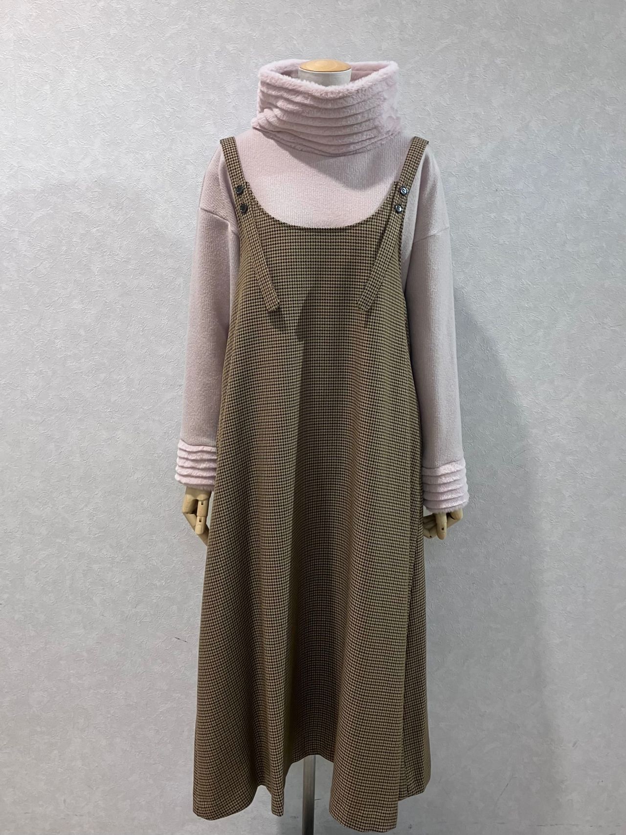 ジャンパースカートのインナーに合わせるとまた雰囲気が変わります!