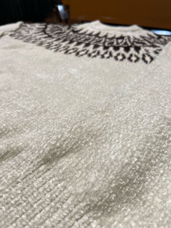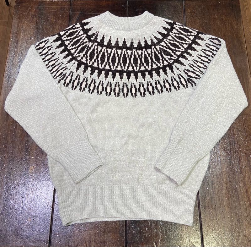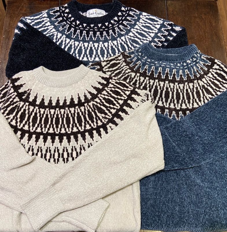 ノスタルジックな雰囲気の求心柄が目を惹くニットです。