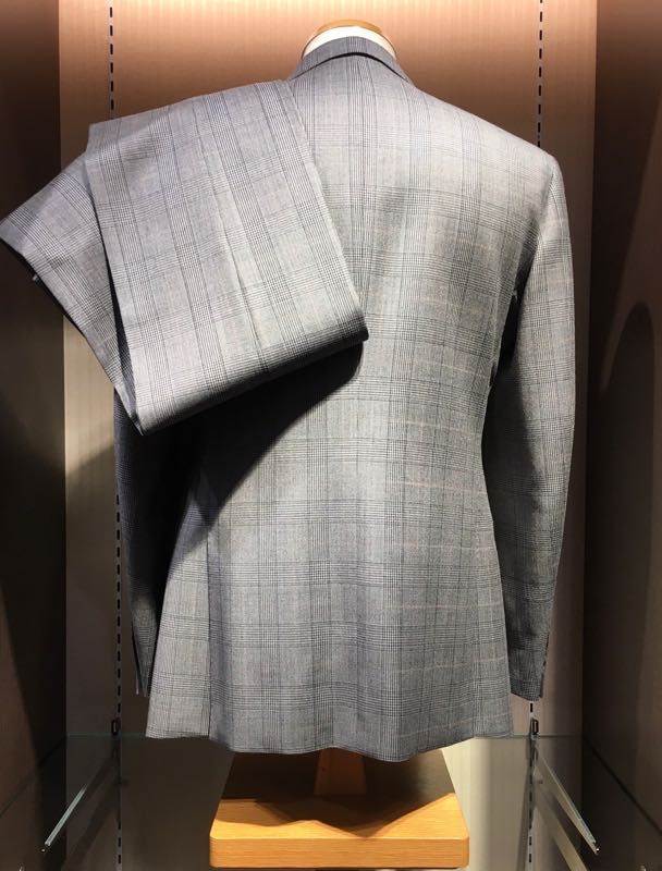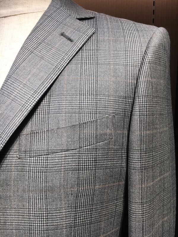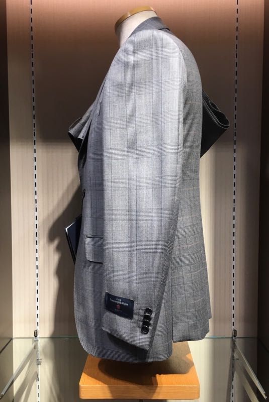 ジャケットは段返りの三つボタン、サイドベンツ仕立て。