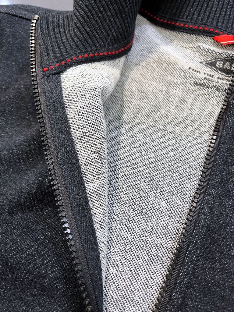 吸湿性のある裏毛(タオル地のようなパイル生地)、着脱しやすいフロントジップ仕様により、軽く羽織るのに最適な一着です。