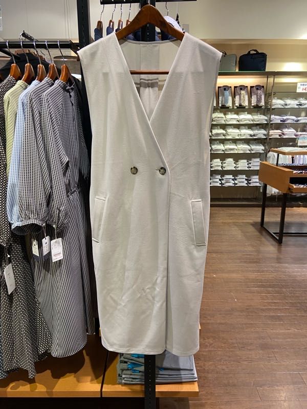 ボタンを閉じてワンピース風にも着用可能なロングジレ。