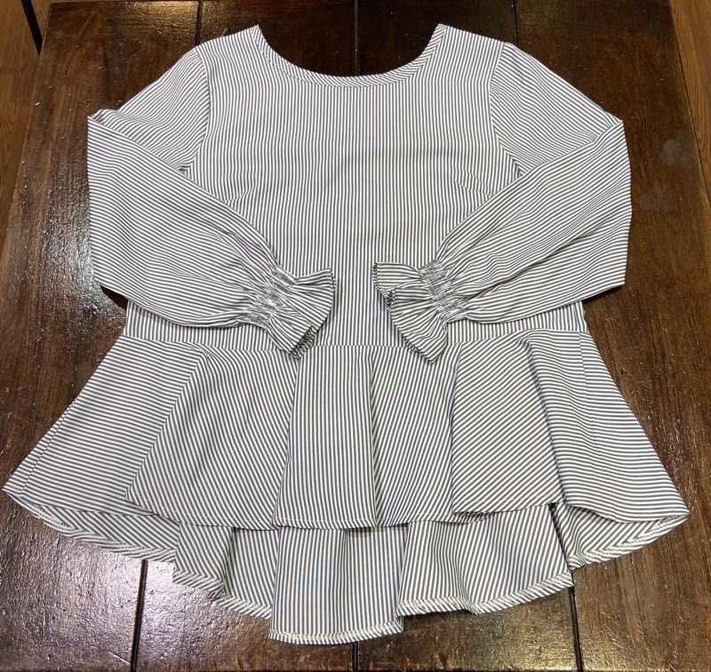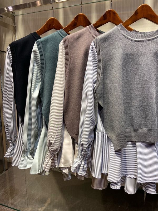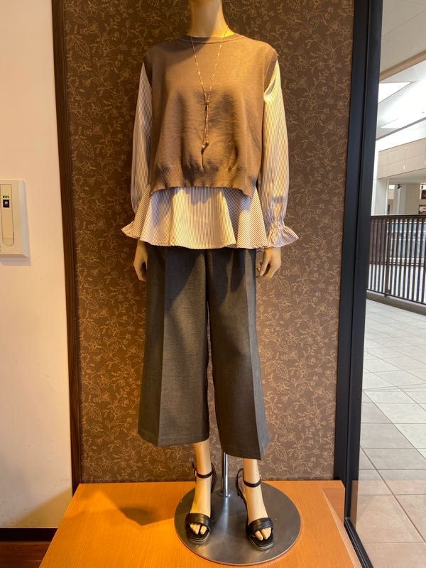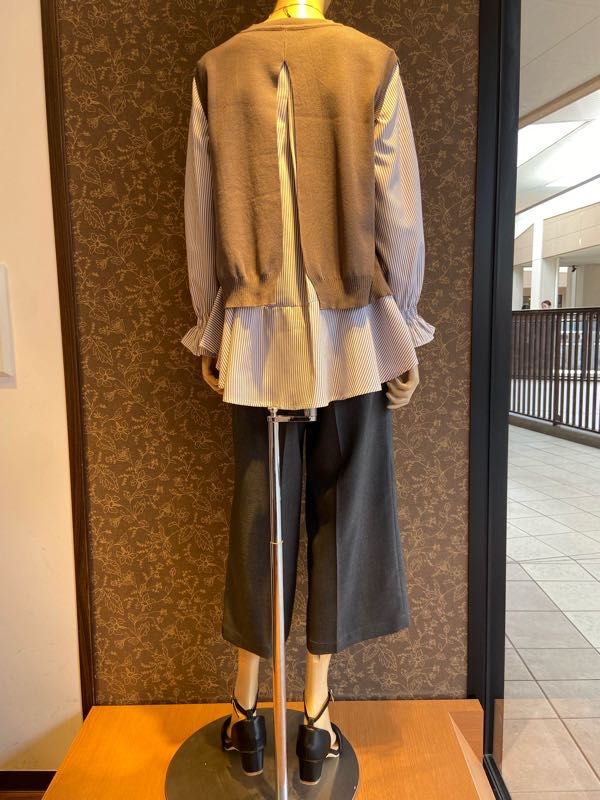 ストライプのペプラムブラウスとニットベストのアンサンブルトップスです。