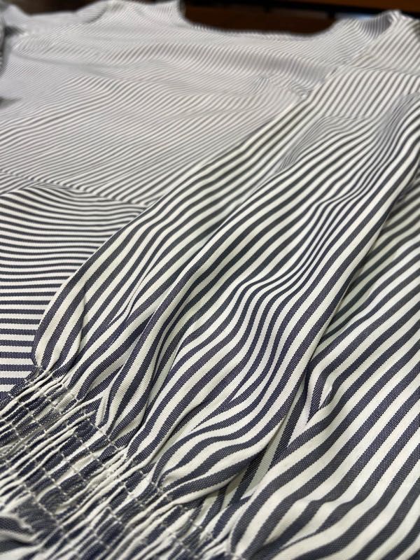 ブラウスの袖口にはゴムギャザーが使われており、たくし上げたアレンジも楽しめます。