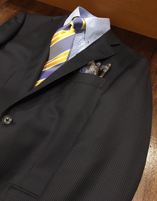 “段落ちストライプ” と呼ばれる、同じ太幅のストライプタイは、胸元にメリハリのある存在感が出ます。