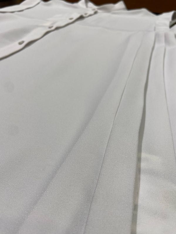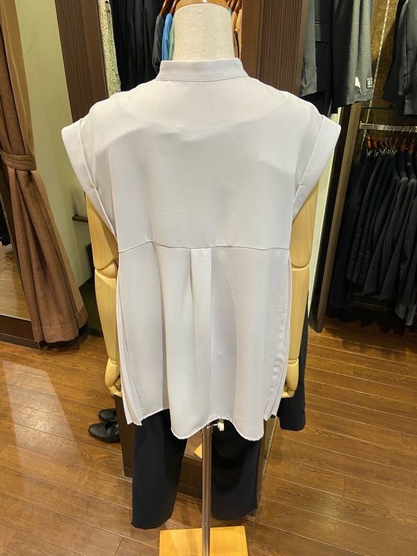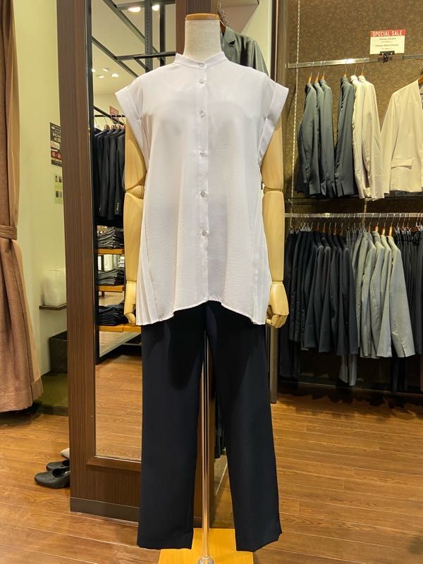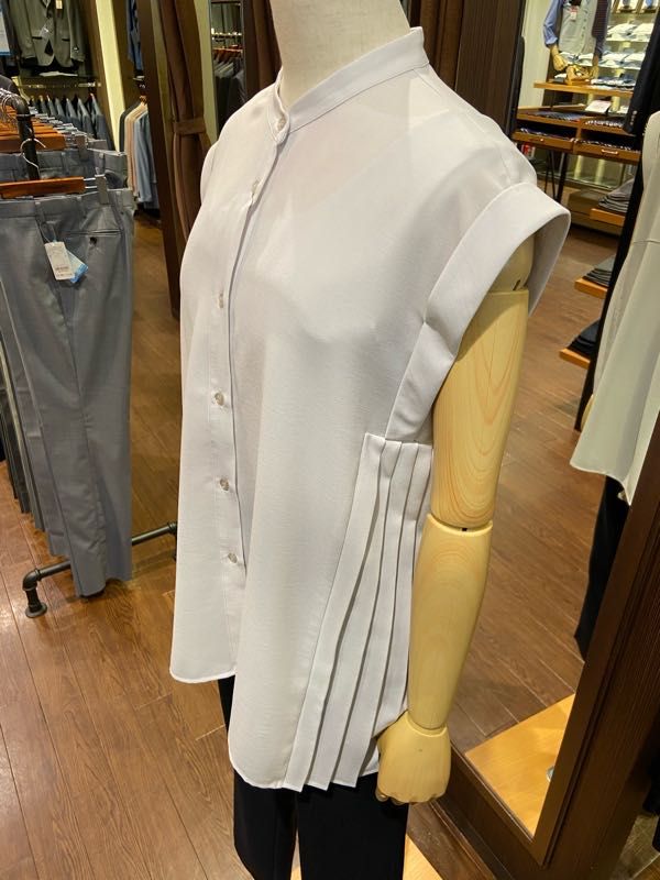 薄手で柔らかいジョーゼット生地を使用し、トレンドのバンドカラーとフェミニンなプリーツが程よくマッチした大人シャツです。