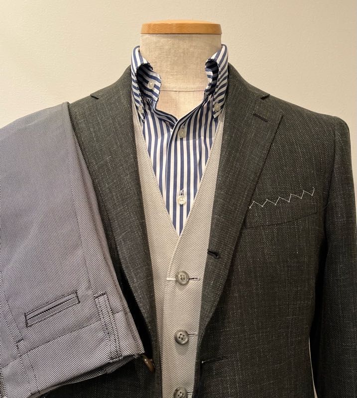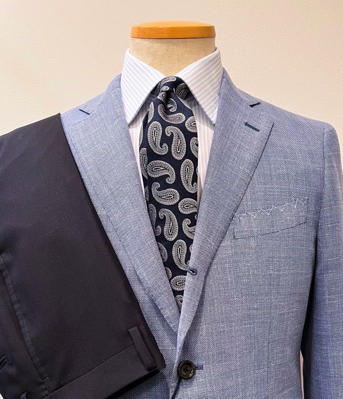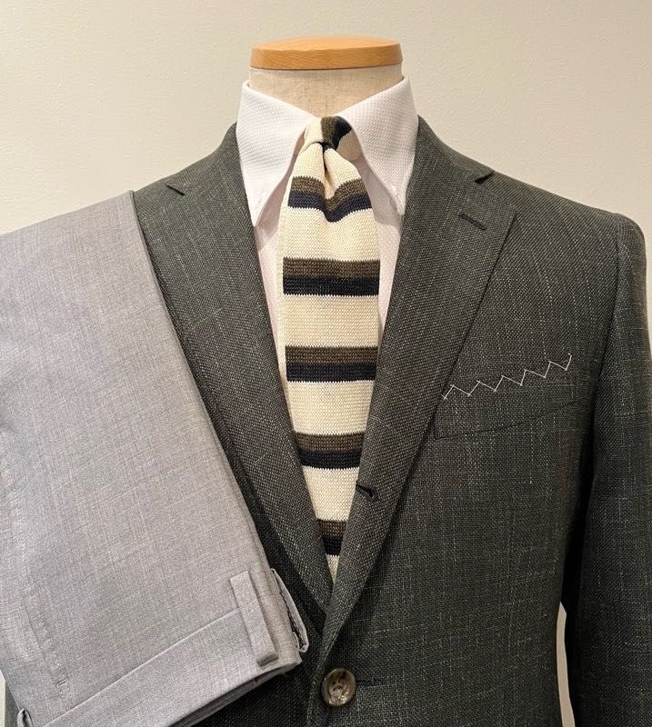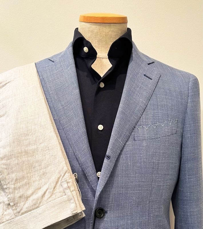 夏らしい爽やかな色味のジャケットで、ウール、シルク、リネンの三者混は日本の夏の気候に最適です。