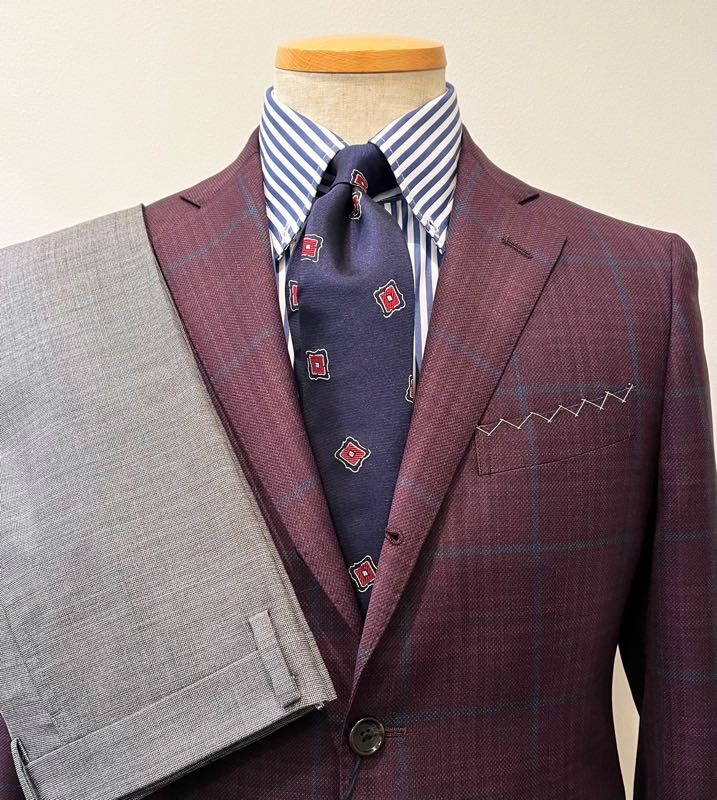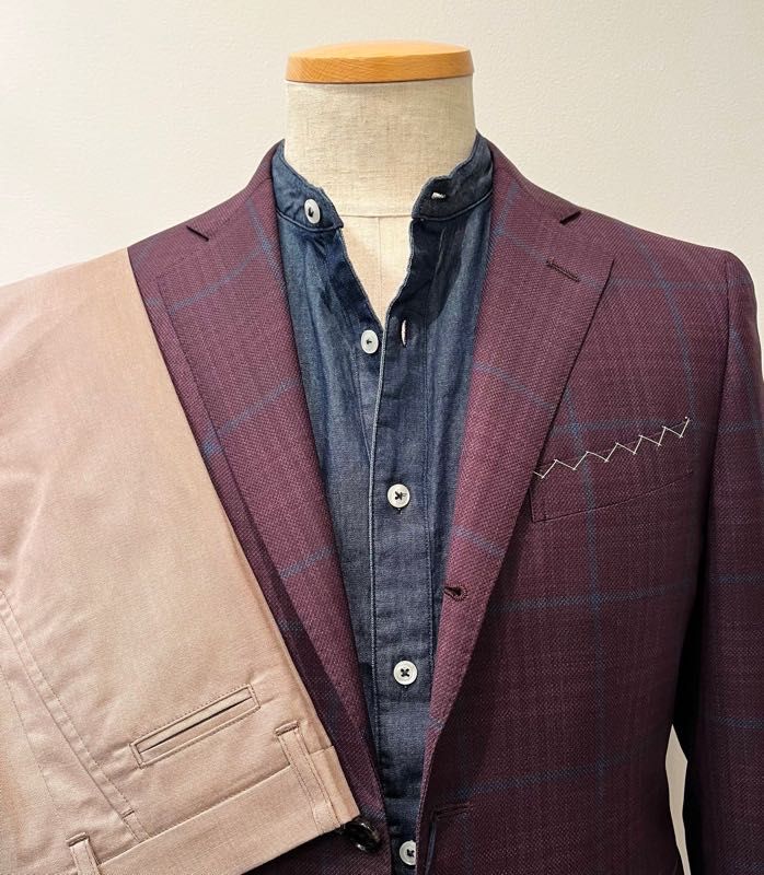 ボルドーにブルーのペインが乗った、上品なジャケットです。