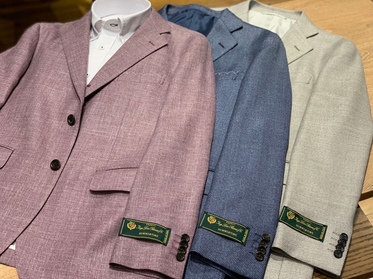 今までに無かったような珍しいチェック柄や夏物ジャケットの定番ともなりつつあるグリーンが非常に綺麗です。