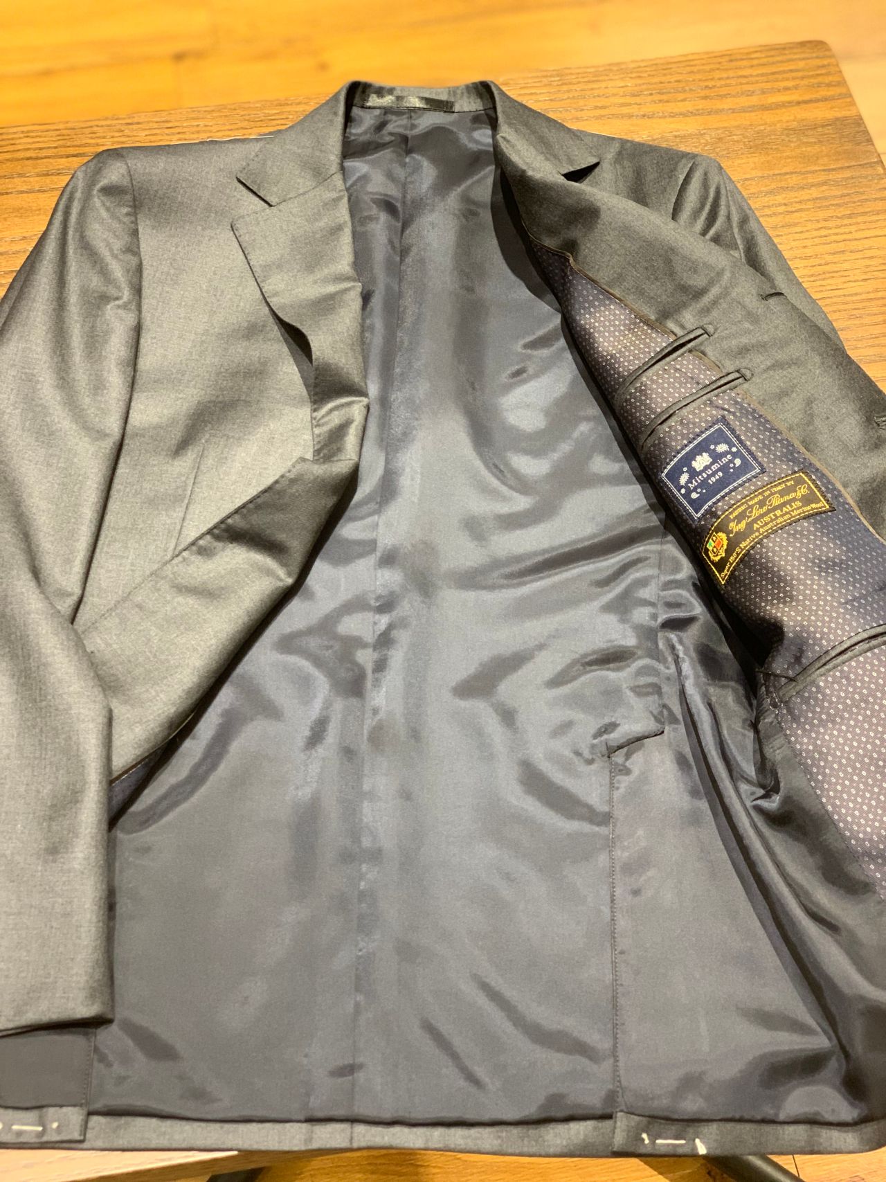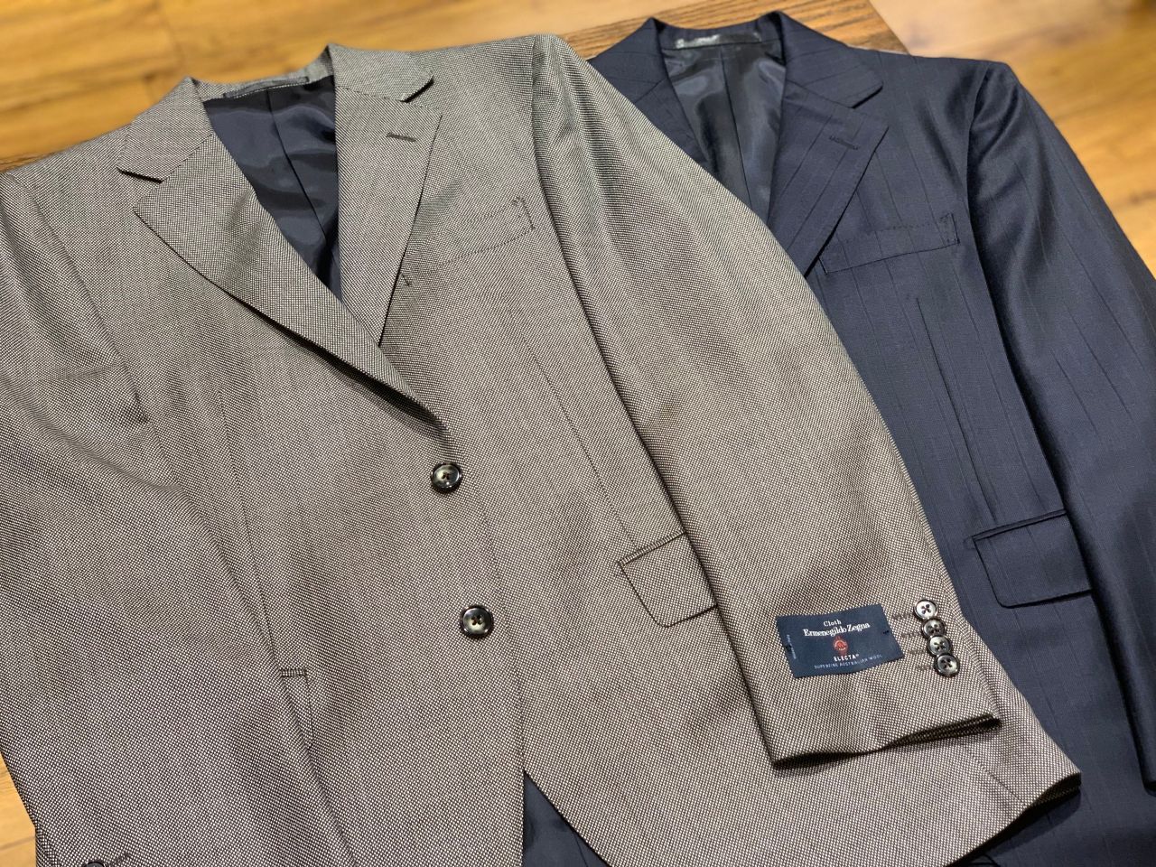 ネイビーとグレーの綺麗な艶感を写真では伝えきれないので是非店舗にてご覧ください。