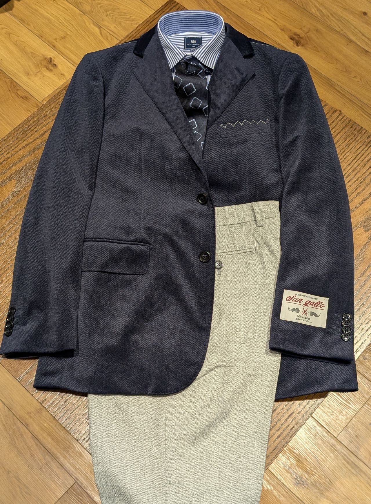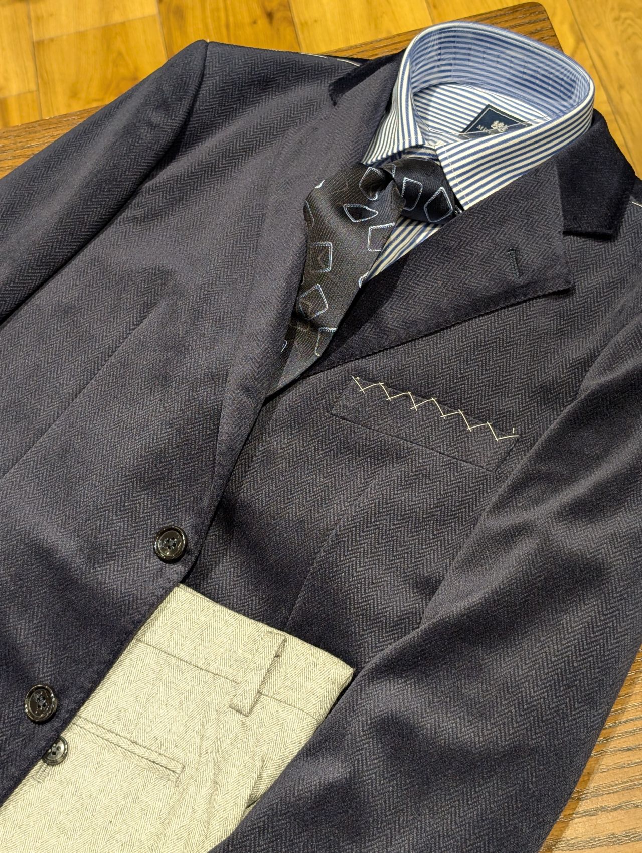 カシミヤブレンドのシルバーグレーのヘリンボン柄スラックスにロンドンストライプシャツ、大柄のスクエア柄ネクタイを合わせています。ジャケットを脱いだ時に白くなりすぎるので、色物のシャツやストライプシャツで合わせました。