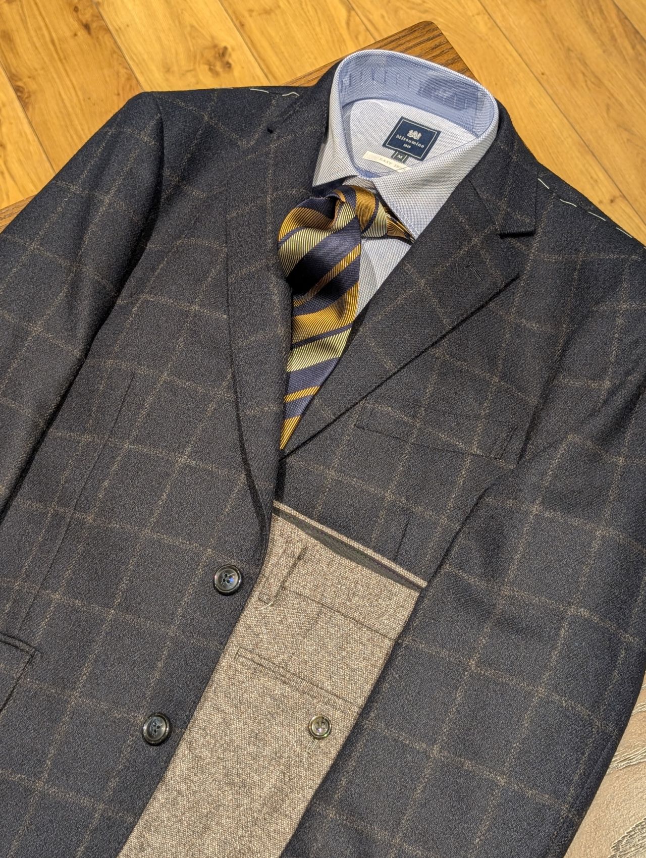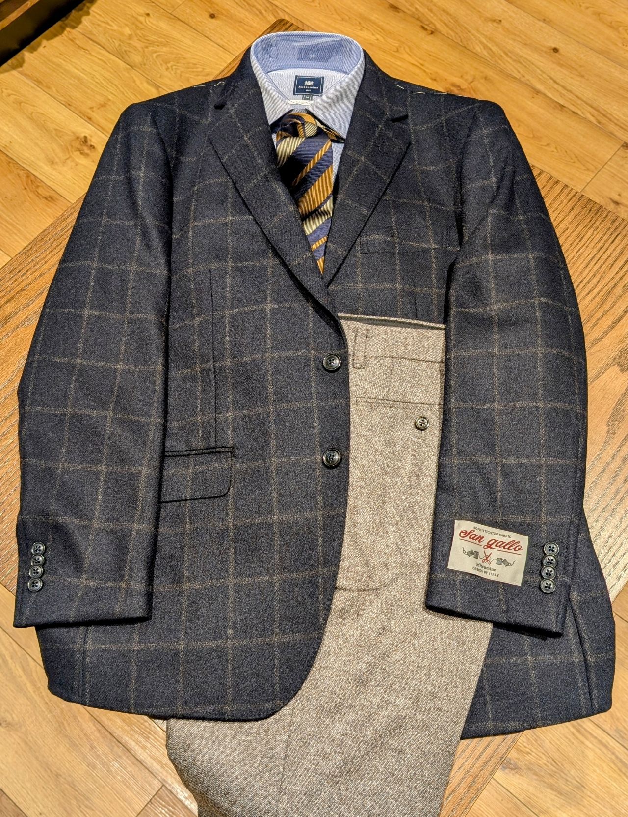 ダークネイビーに大柄なブラウンのウィンドペーンが入っています。