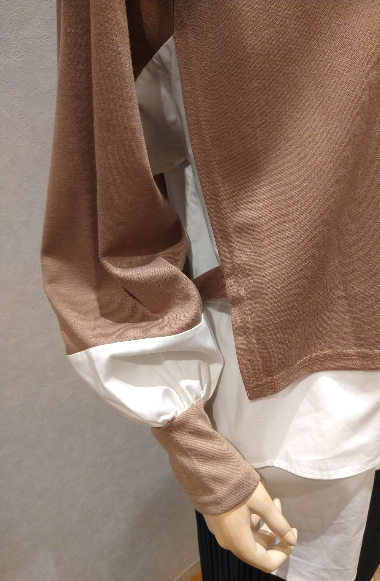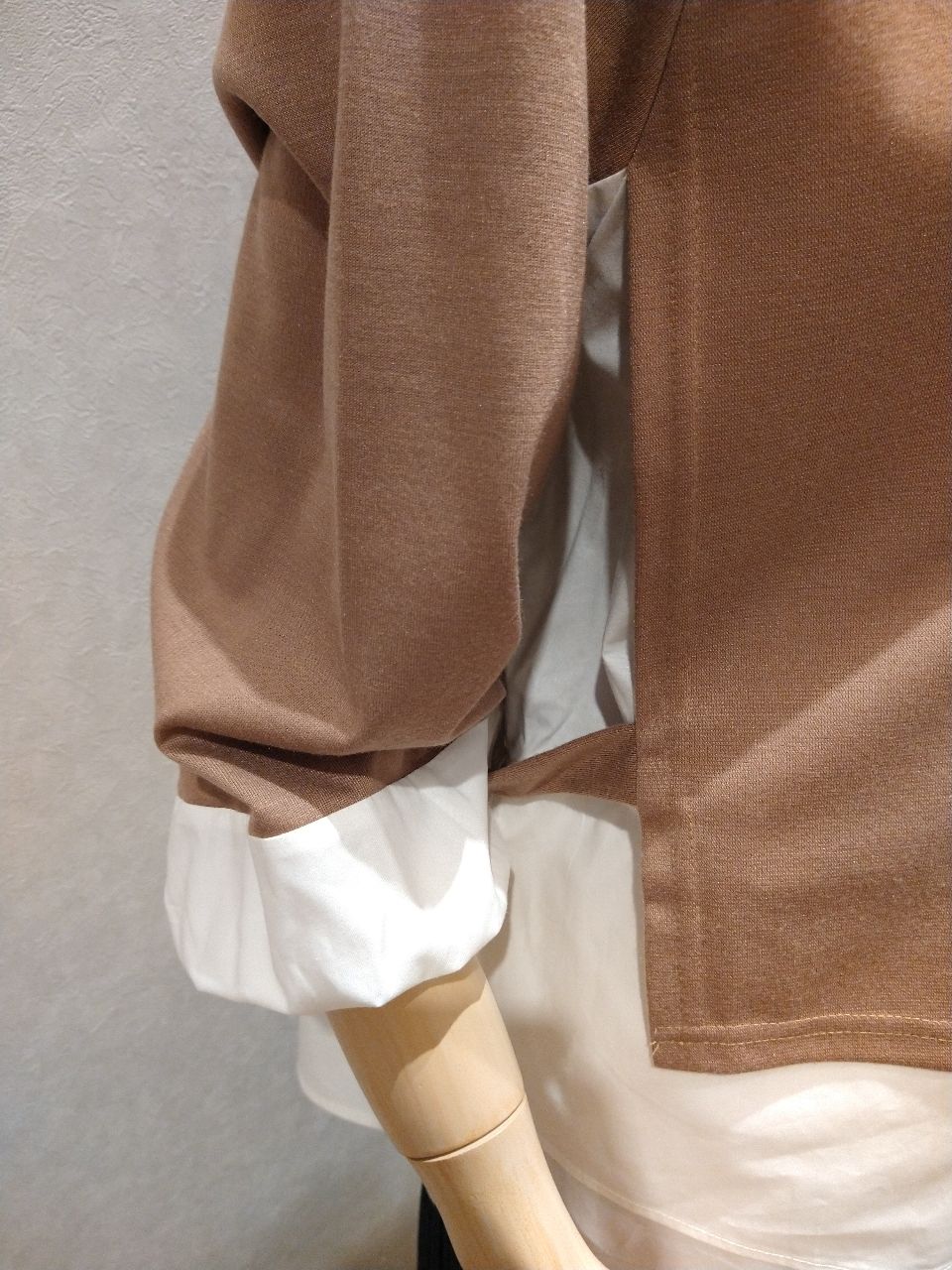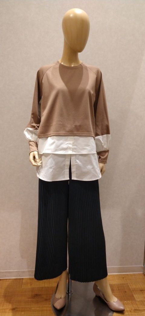 カラーはキャメルで、カットソーとシャツのコンビで一枚仕立てになっております。