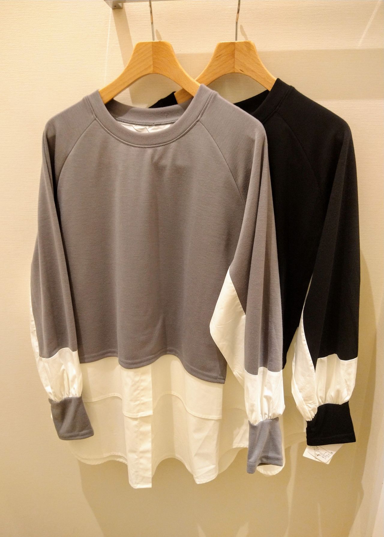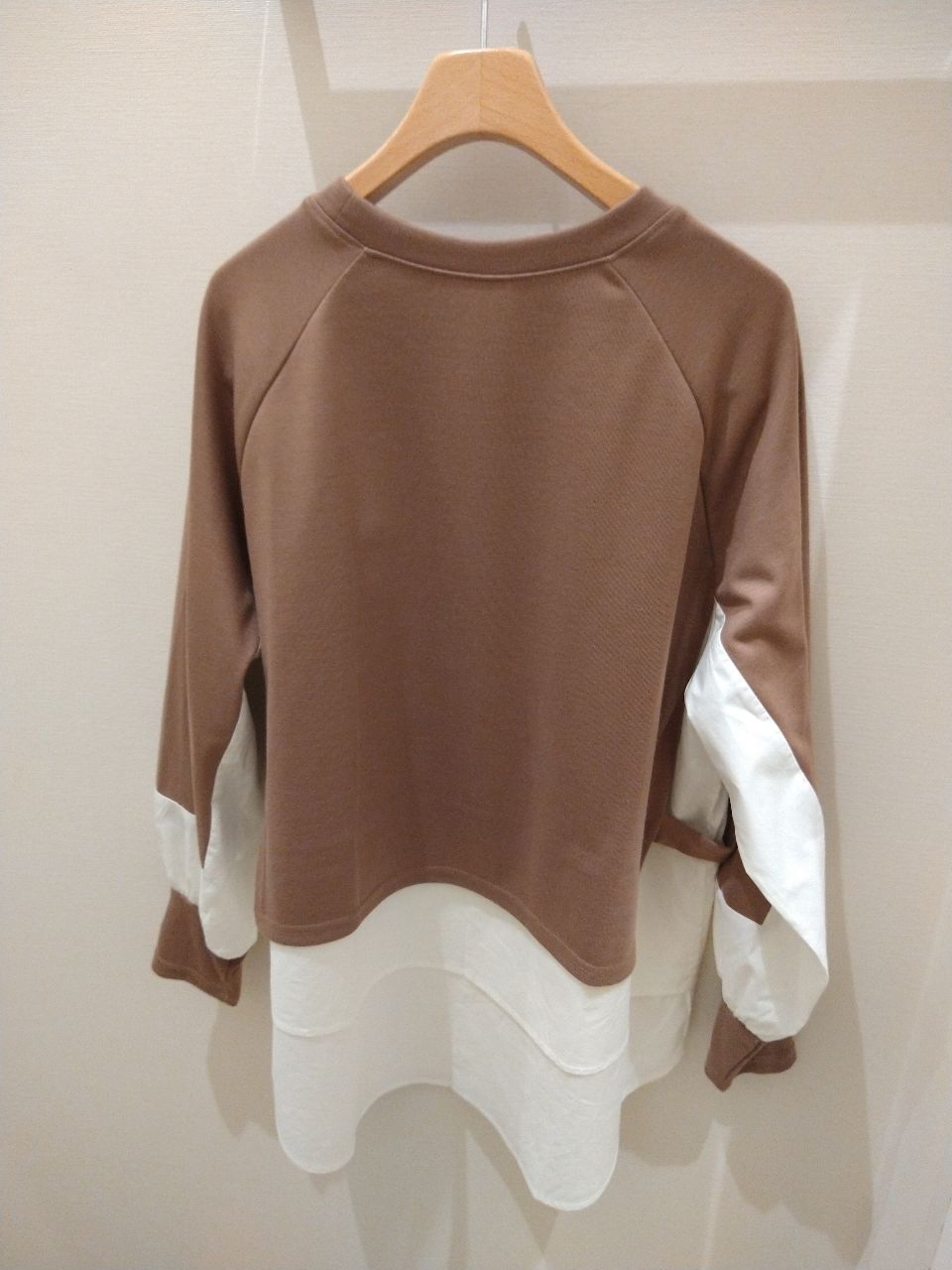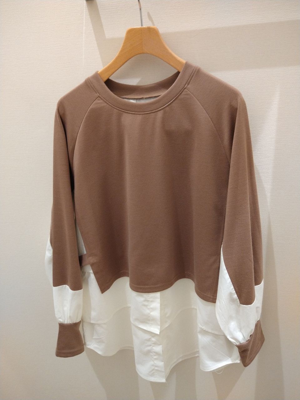 カラーはキャメルで、カットソーとシャツのコンビで一枚仕立てになっております。