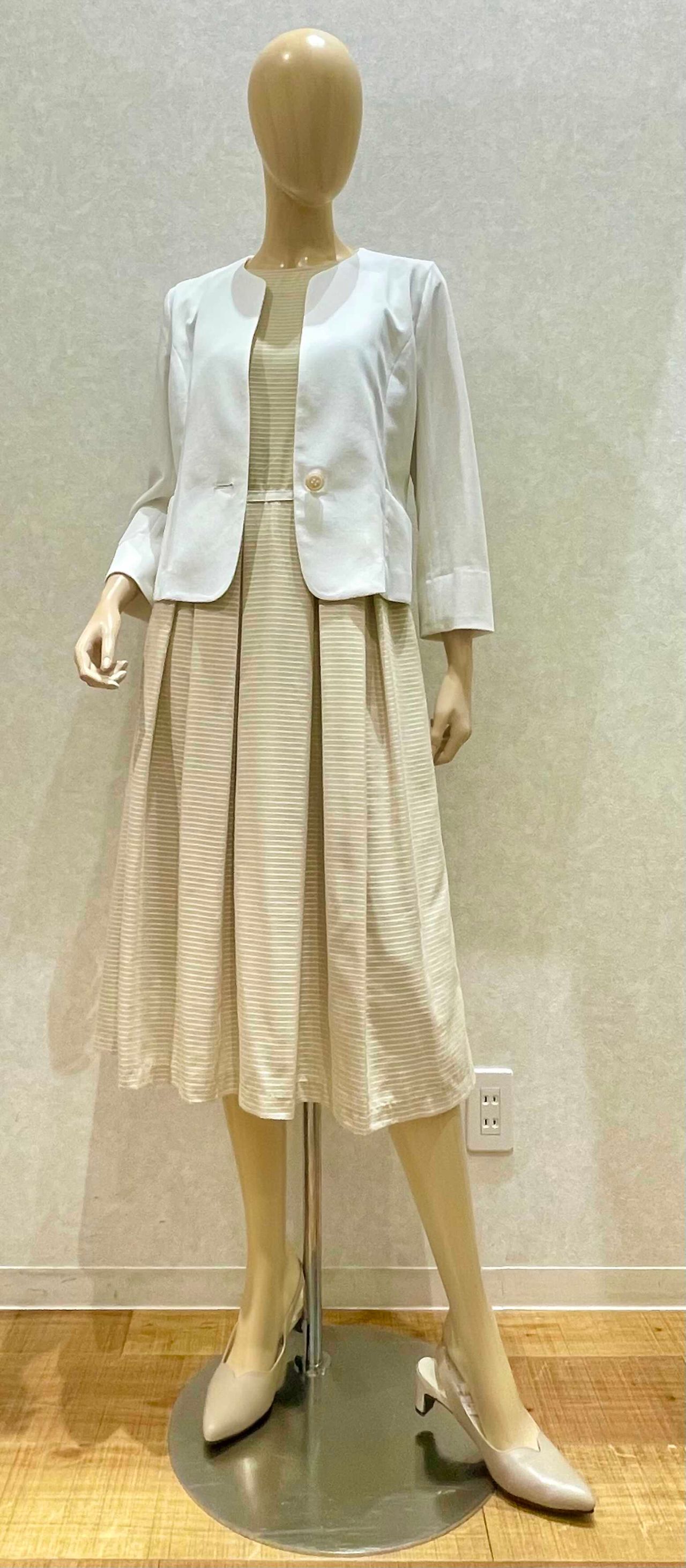 ベージュのワンピースに白のジャケットを合わせてみました。
