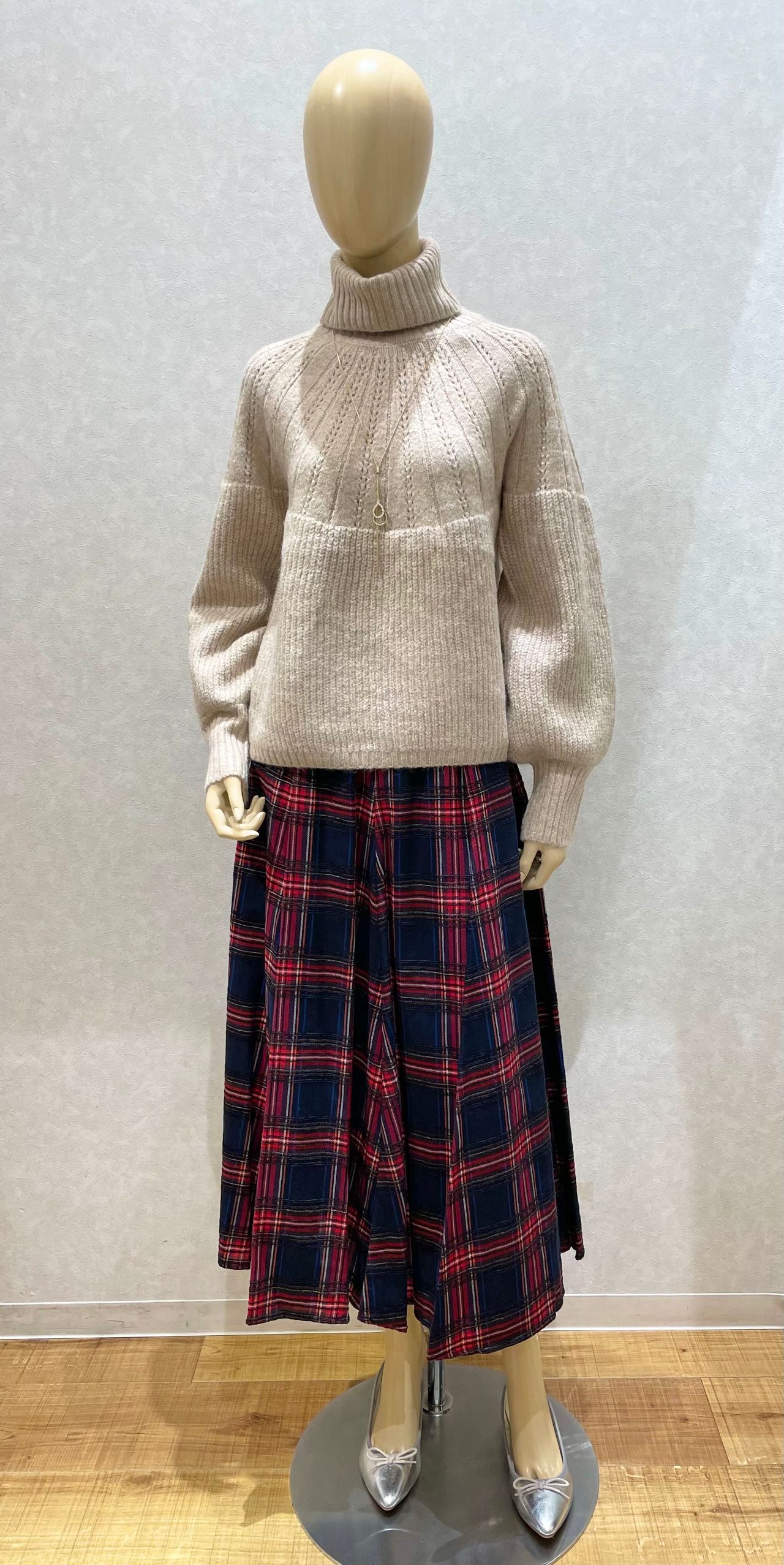 赤いチェックのロングスカートに、ベージュのニットで大人カジュアルに合わせてみました!