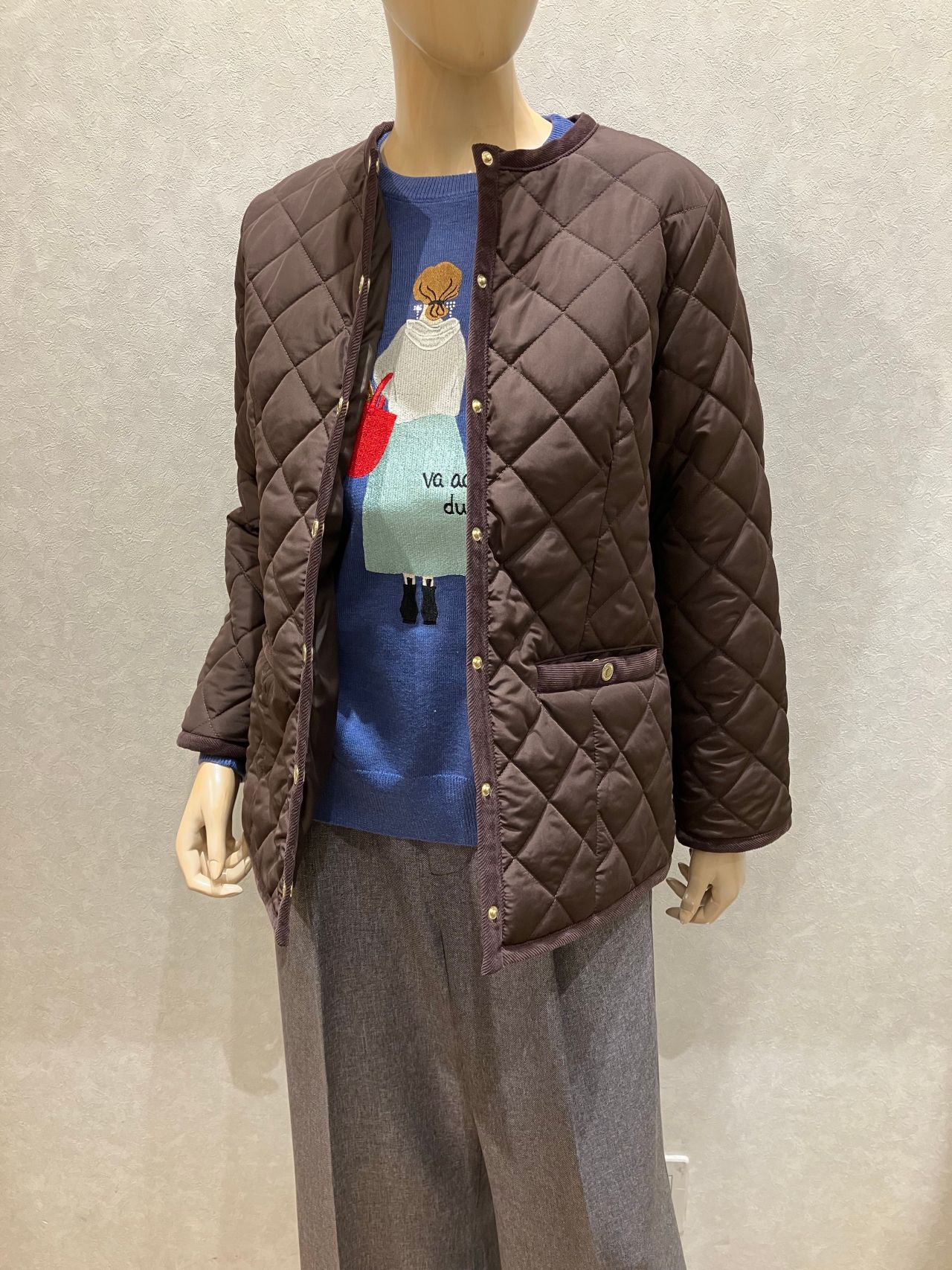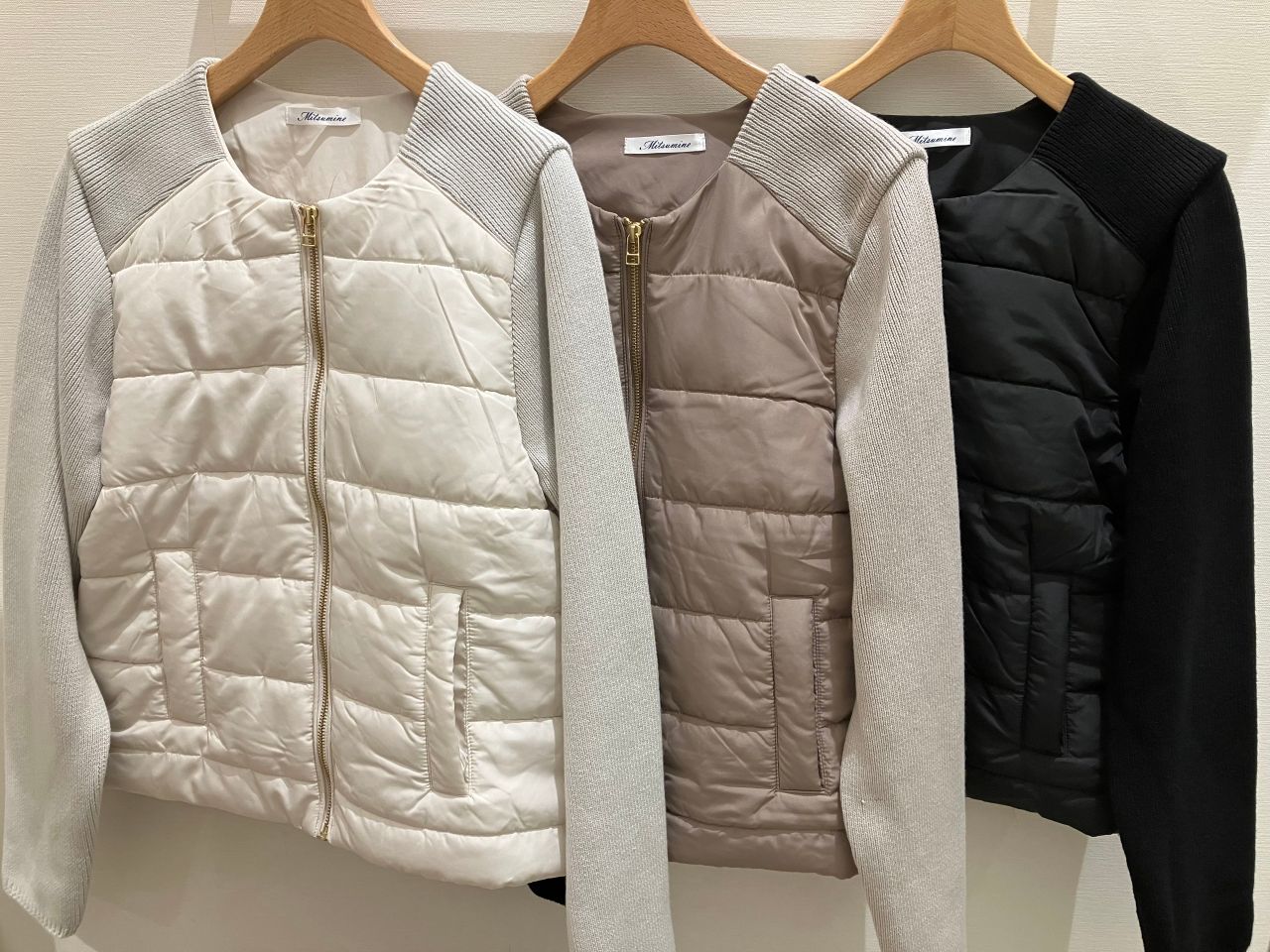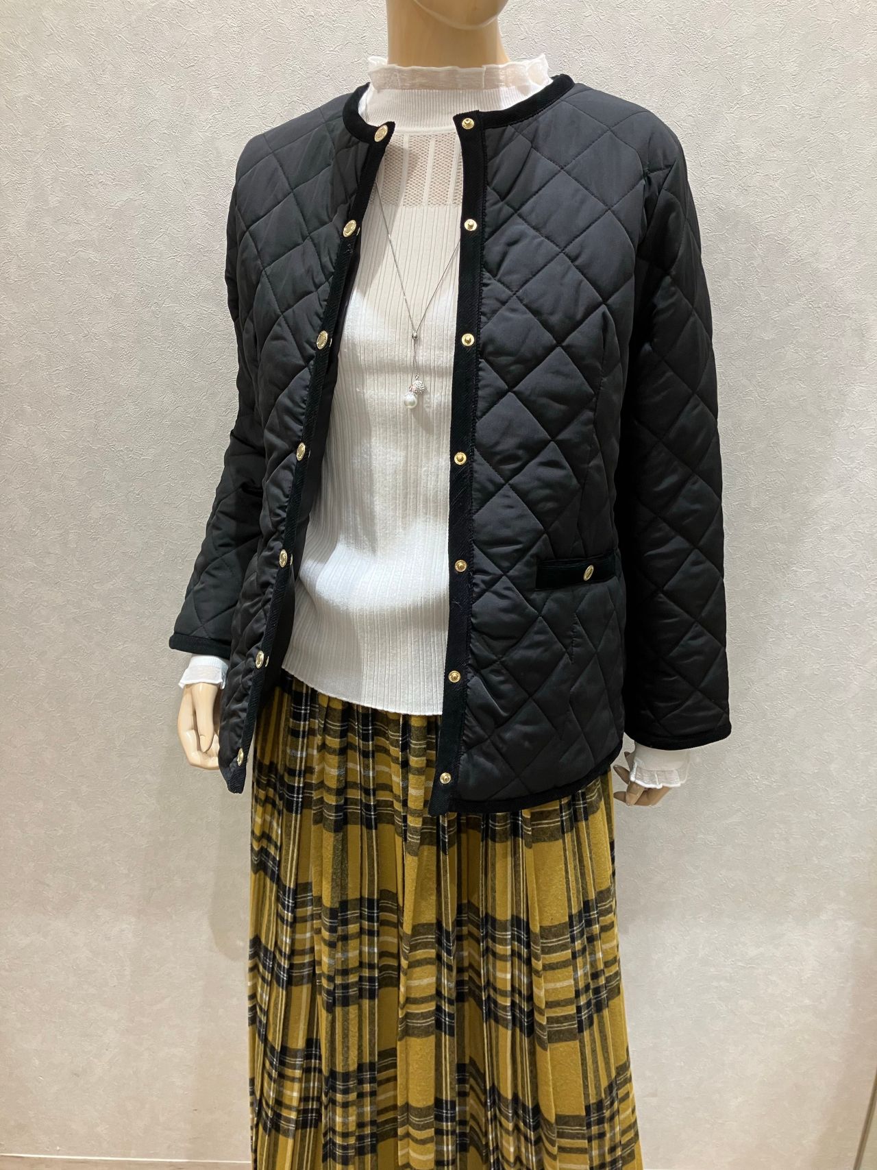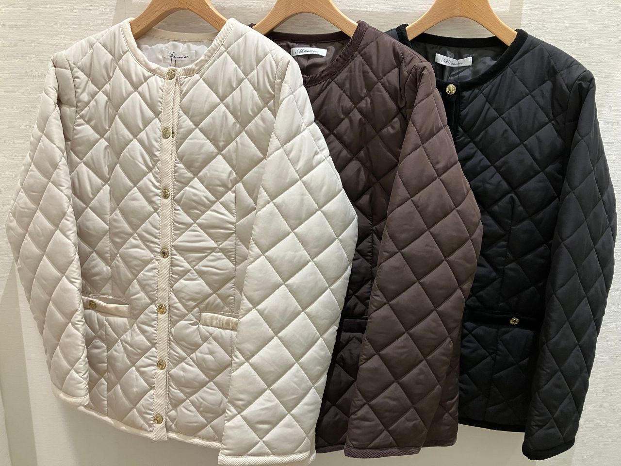 1つ目は、ノーカラーキルティングアウターです