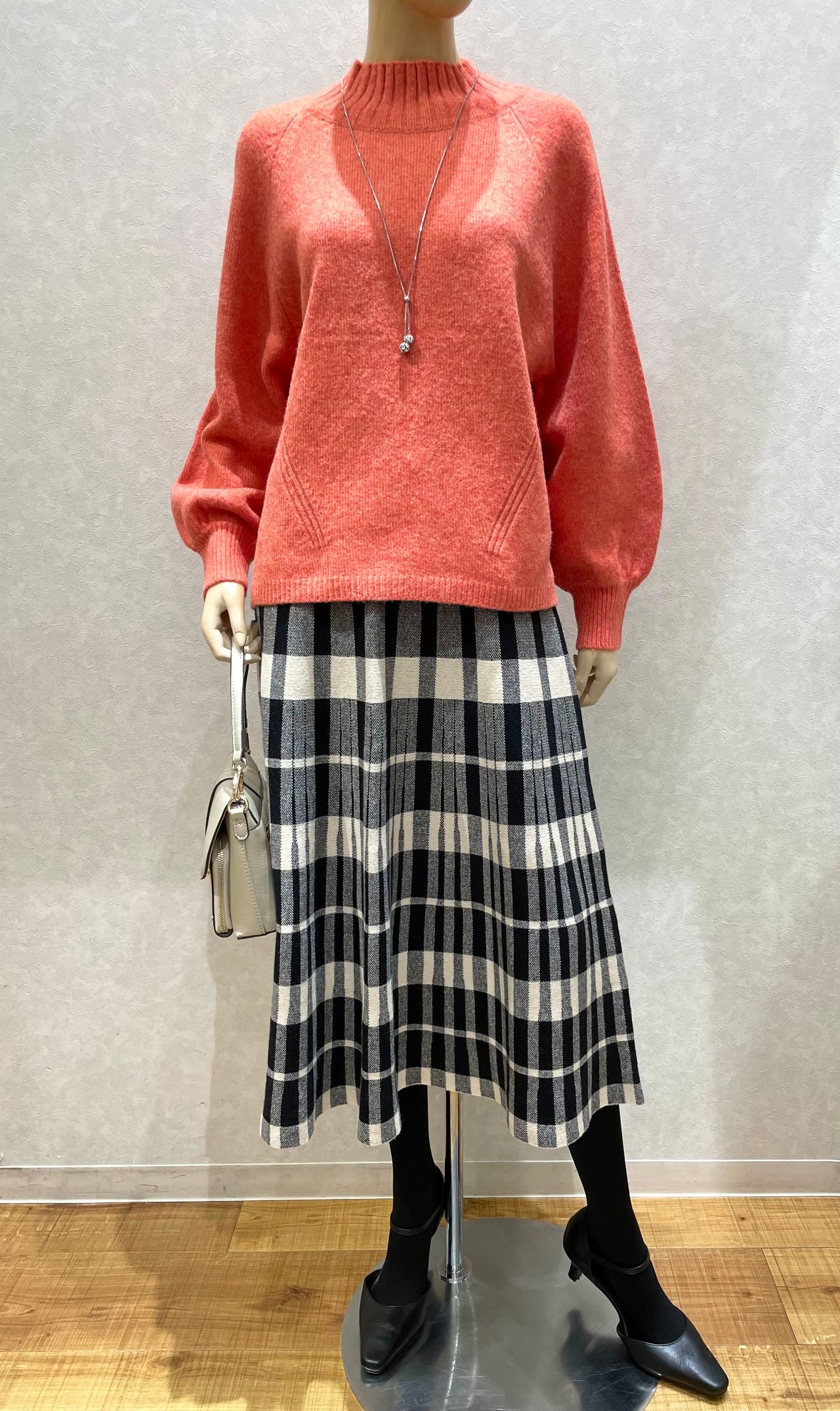 ウエストが総ゴムで程良い肉厚感があるチェック柄スカートで、華やかなコーディネートにしてみました。