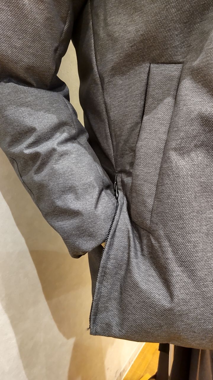 サイドにジップが付いてるので、着たままスラックスのポケットに手が入り、色々な動きに対応しやすくなっています。