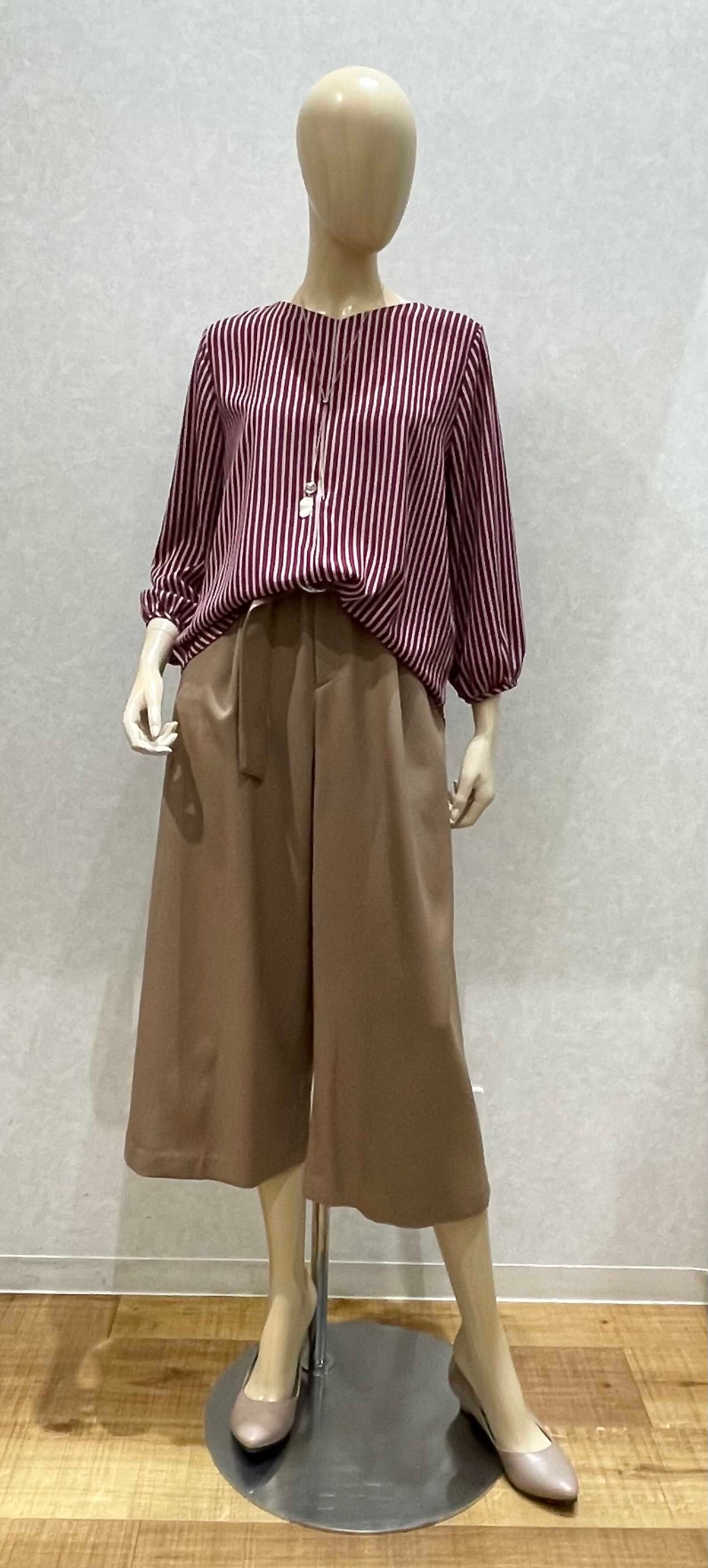 ボルドーのブラウスにベージュ系のパンツを合わせることで秋の雰囲気が出ますね♪