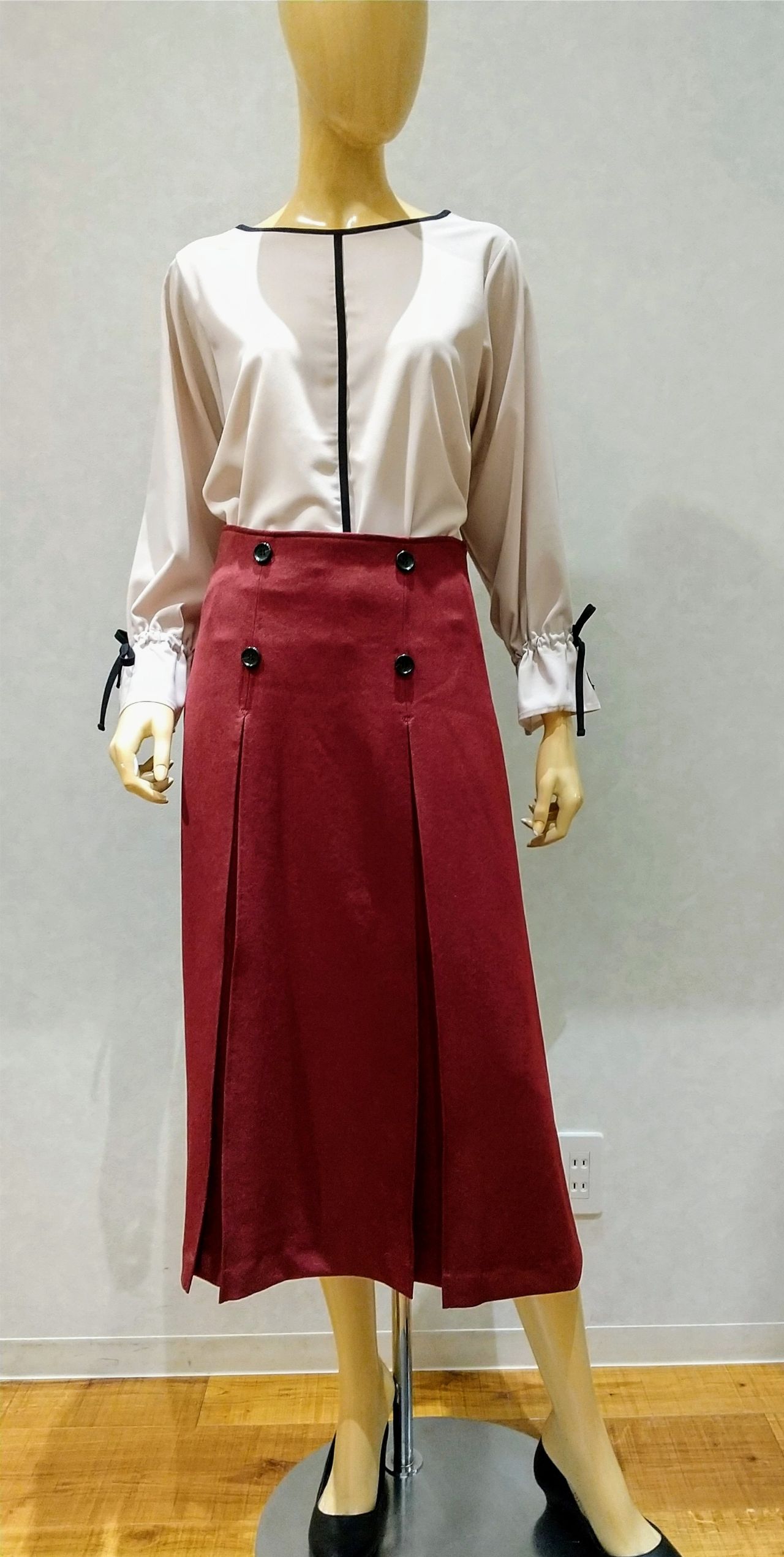 深みのある赤のロングスカートに合わせてみました。