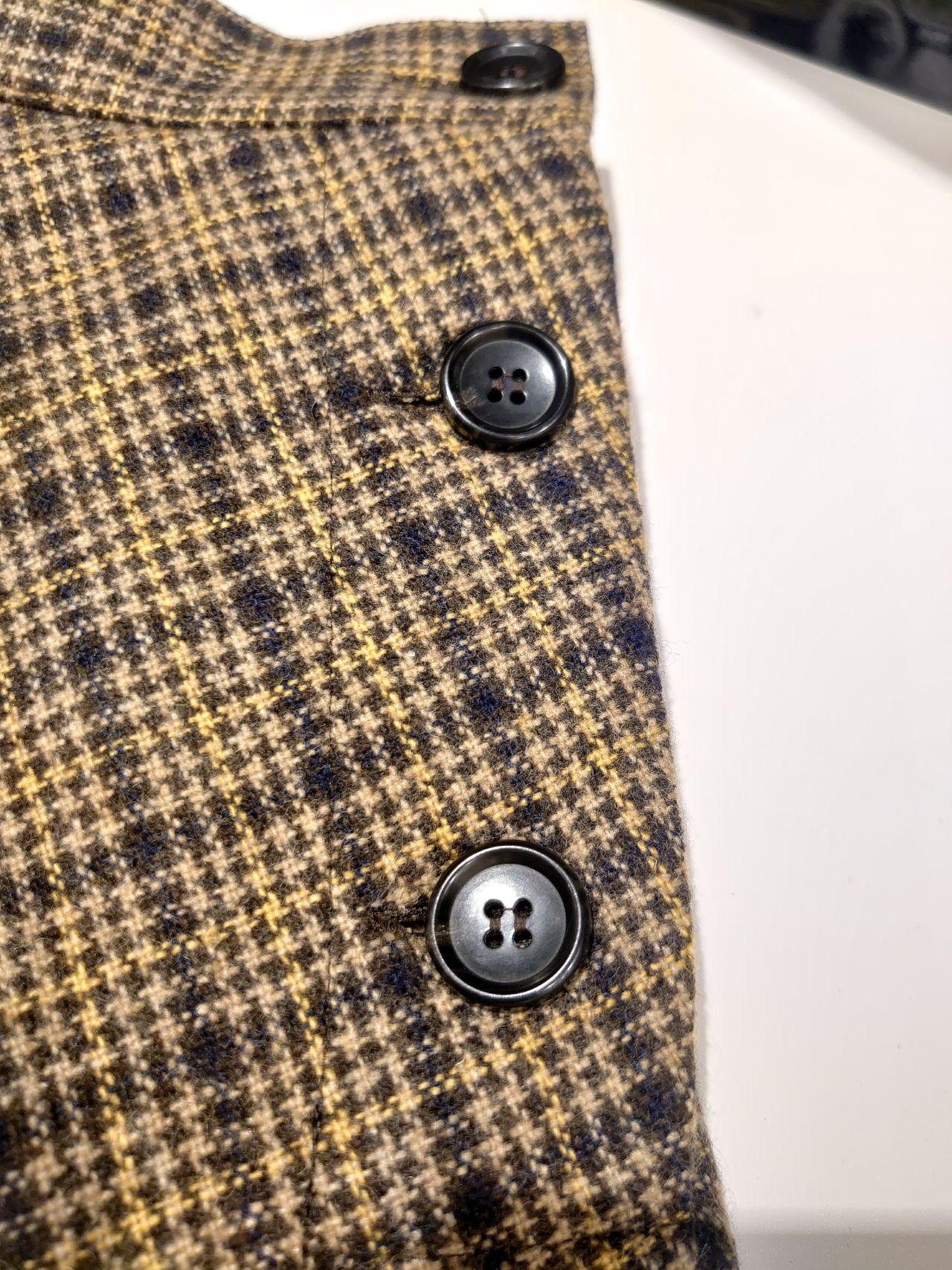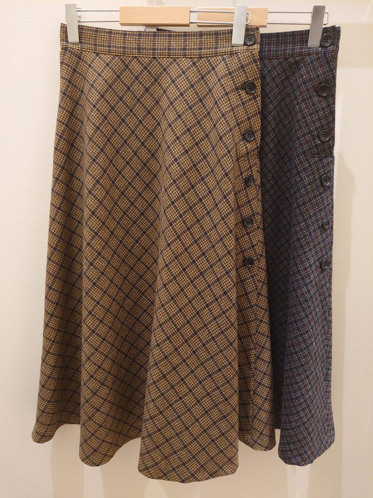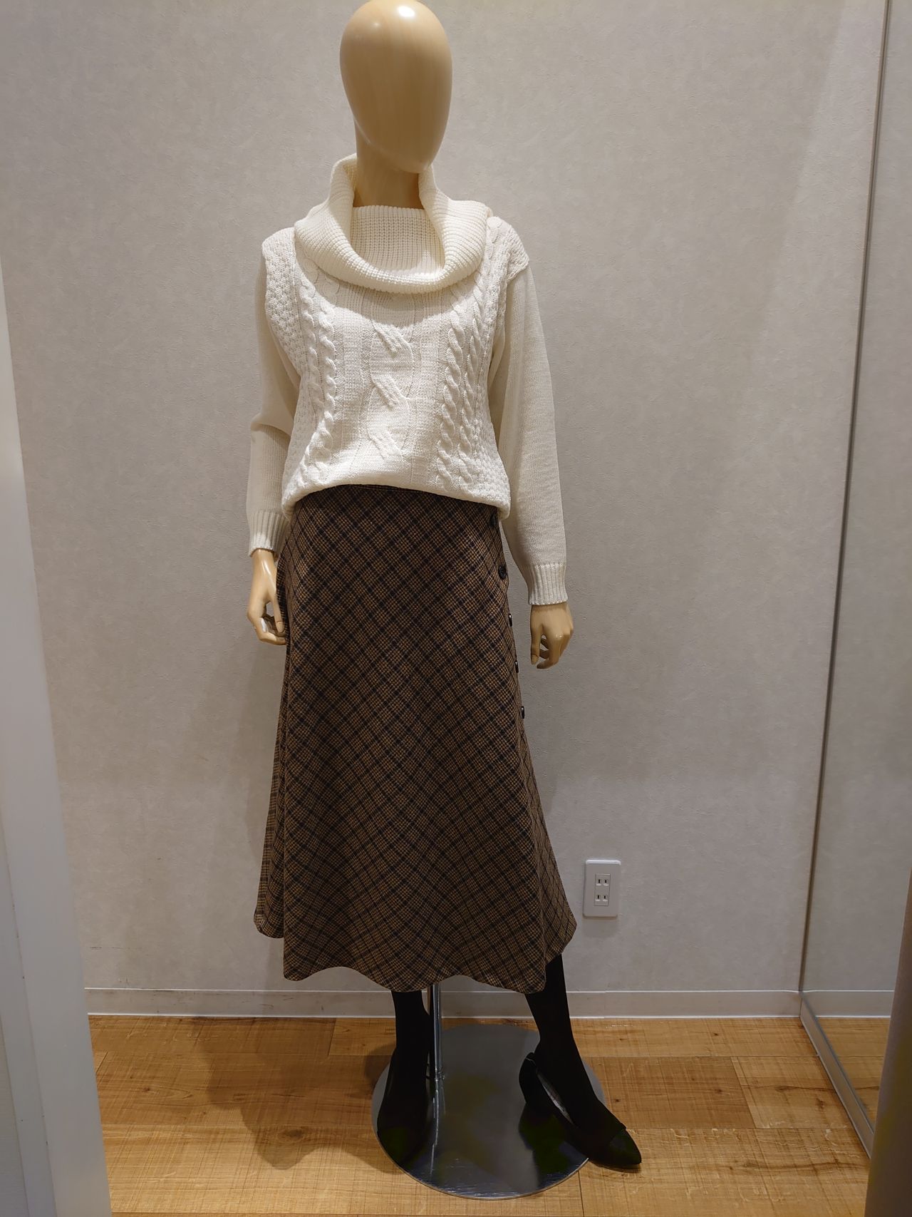 秋冬コーデはトーン暗くなりがちですが、カラーラインチェックのスカートと、ケーブルニットを合わせると、