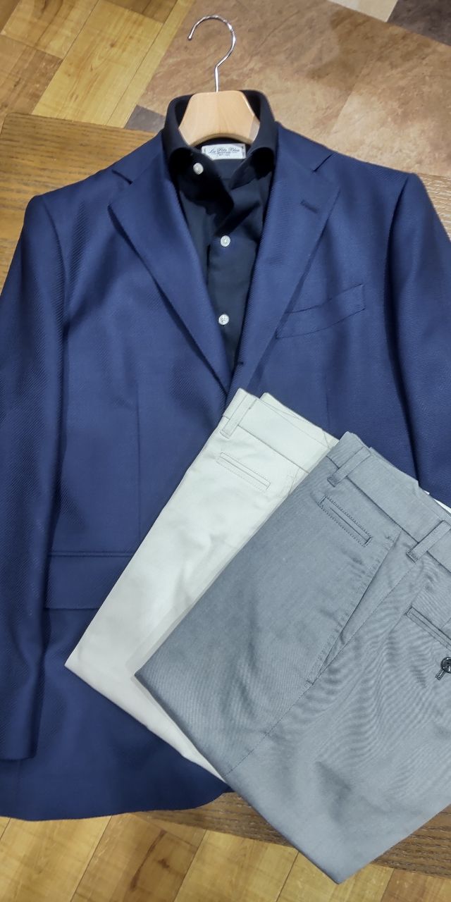 ビジネスシーンで、ネイビージャケットといえば、ブレザーを思い出しますが、シンプルな明るいネイビージャケットもたいへん合わせやすく、重宝しますのでオススメです。
