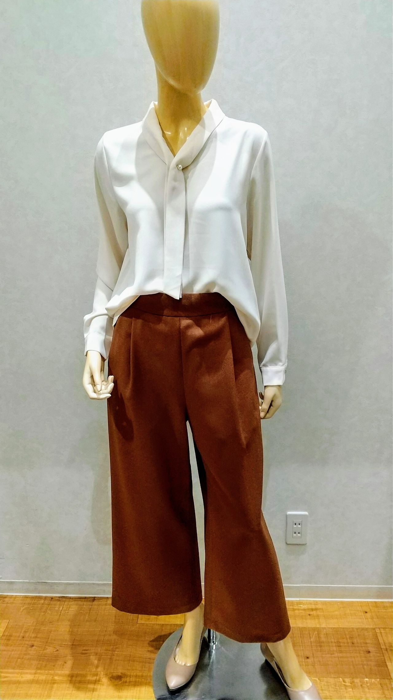 アイボリーのボウタイのブラウスで