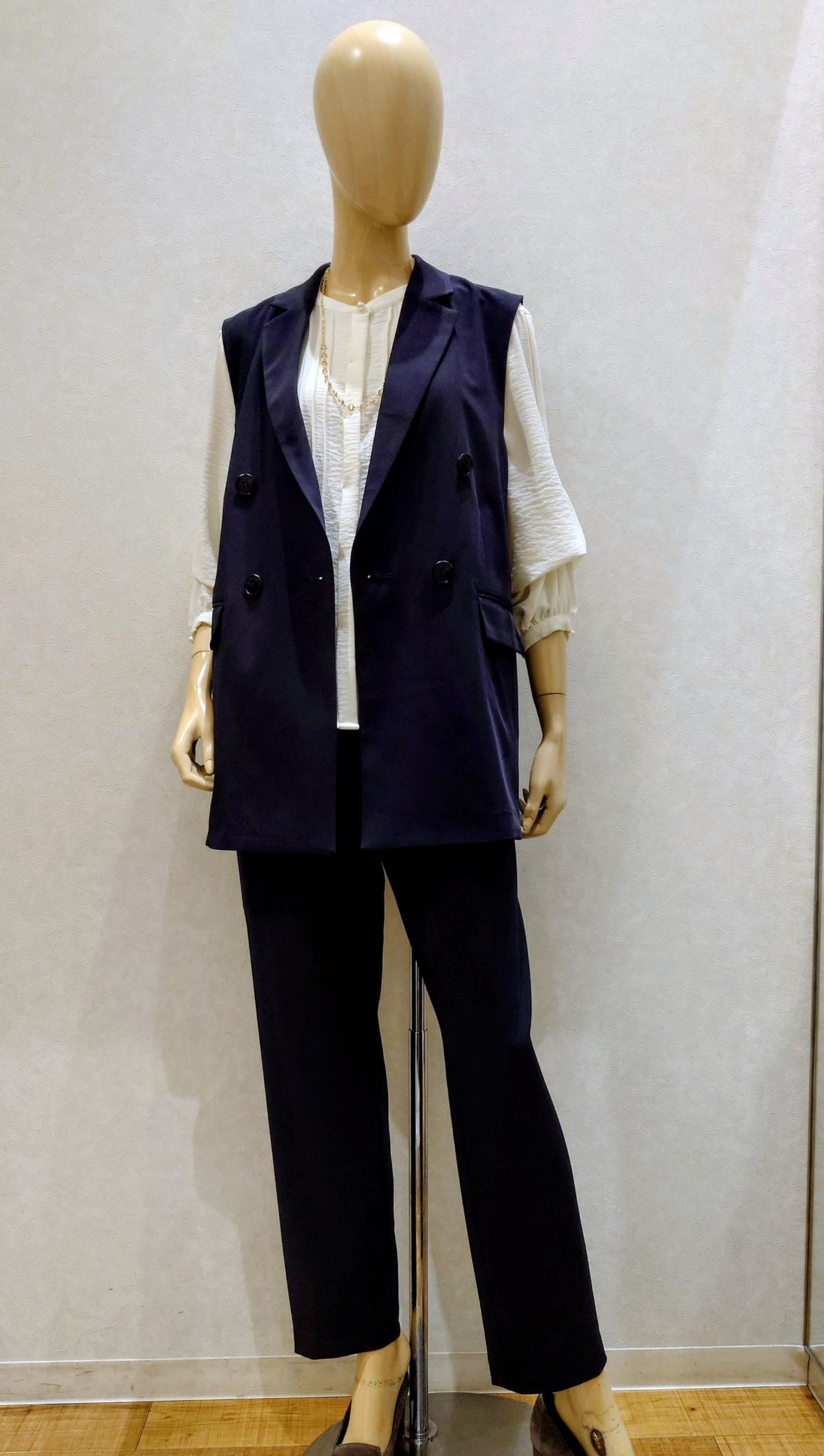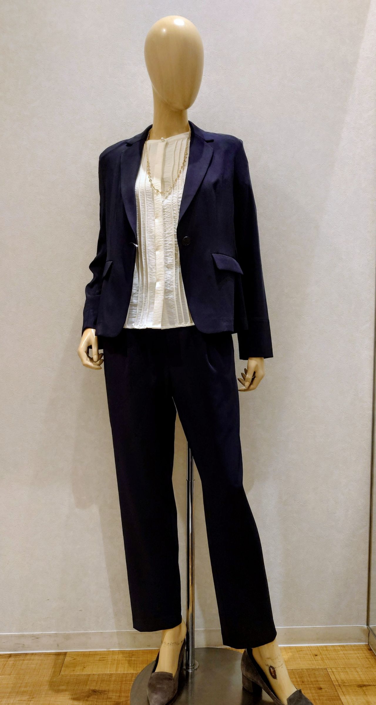 定番のテーラードジャケットとテーラードパンツは