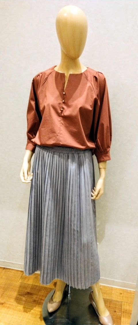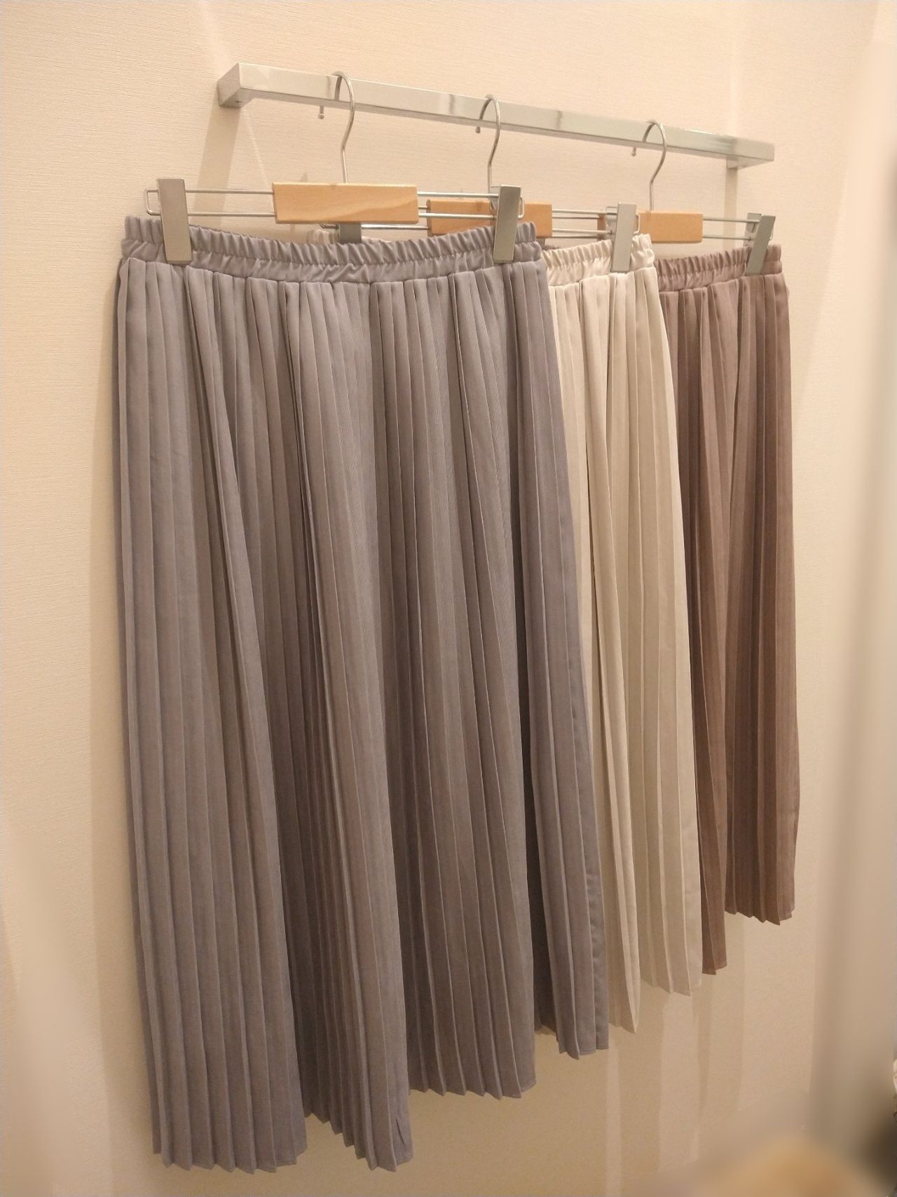 ライトグレーのスカートは寒色系から暖色カラーまでいろんなカラーのトップスと相性がいいです。