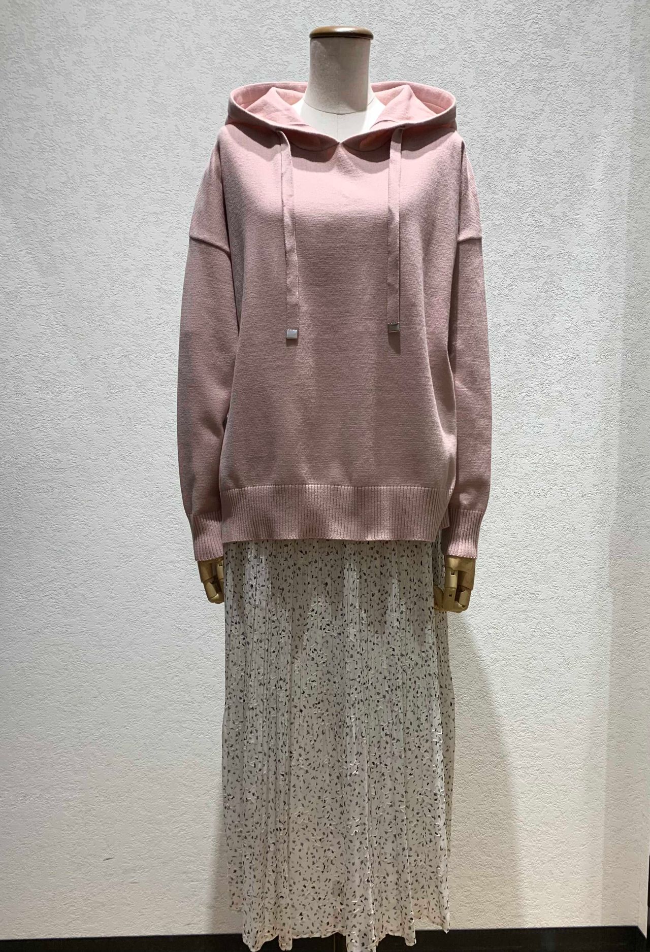 今年流行のフード付きのトップスにプリーツスカートを合わせた女性らしいスタイルです!