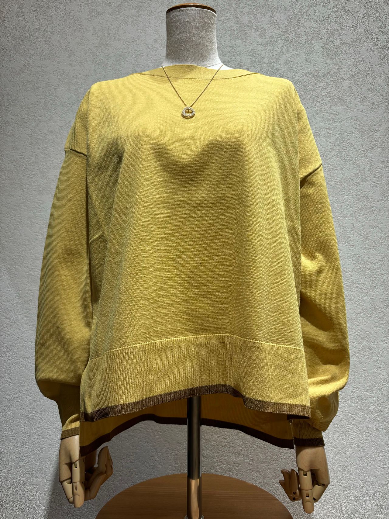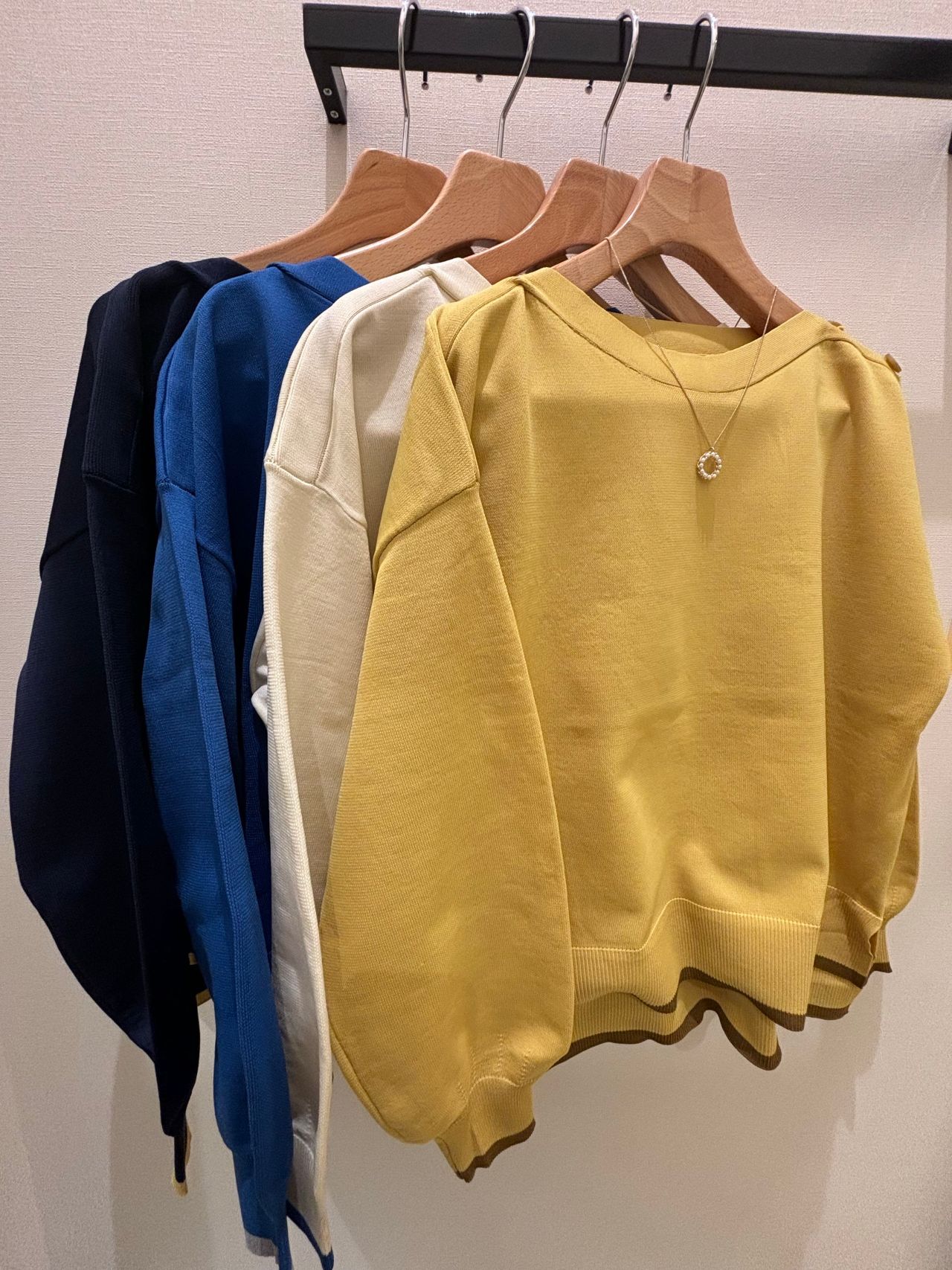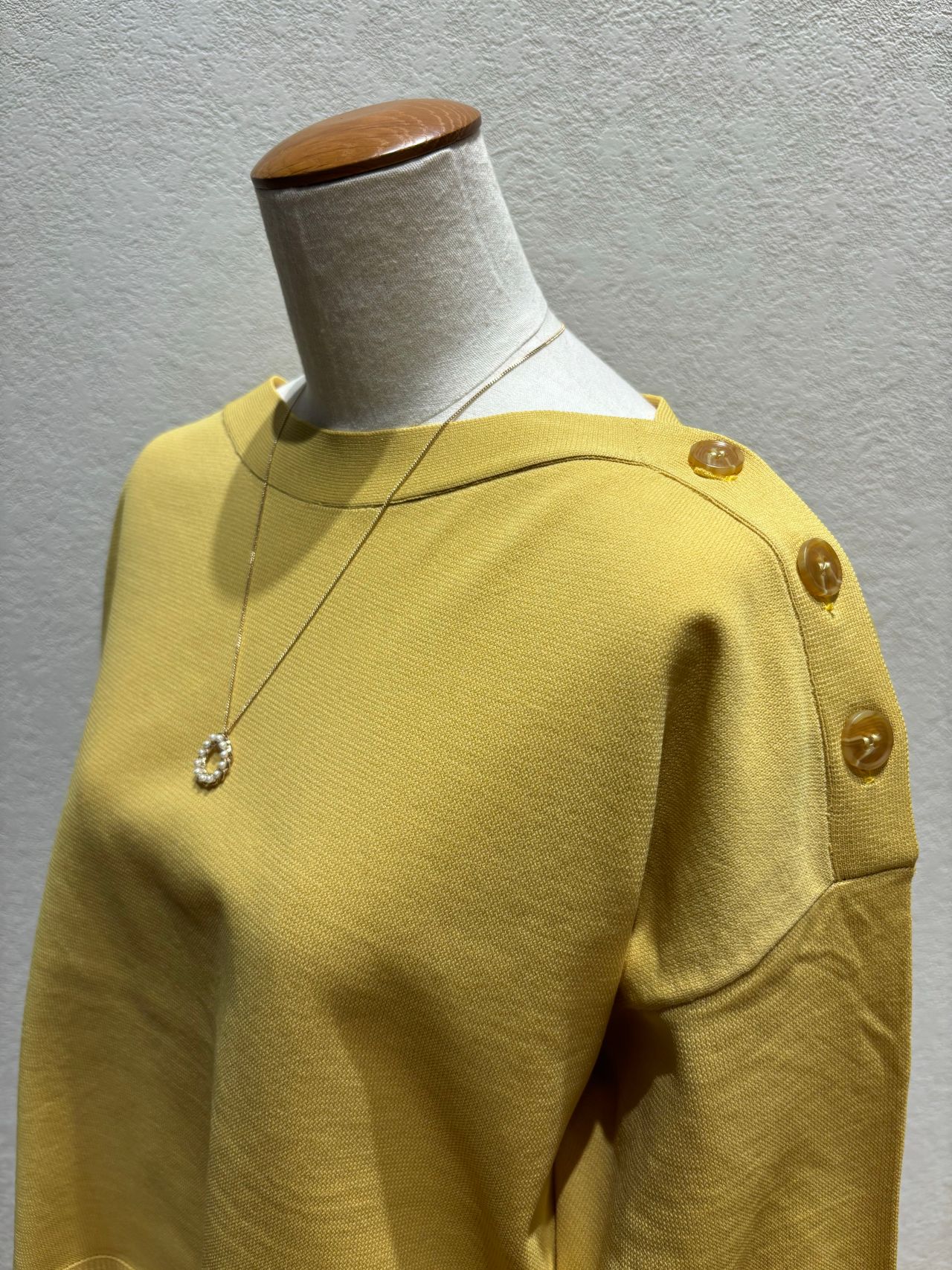 薄すぎず程よい厚みと毛羽感のないすっきりとした生地に、肩釦ボタンが特徴的のゆったりめなニットが登場しました!