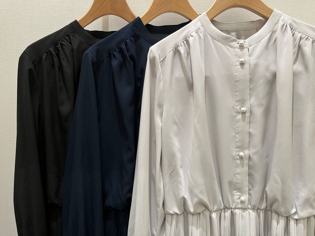 パール・ジョーゼットなどの素材をシャツワンピース型にする事で