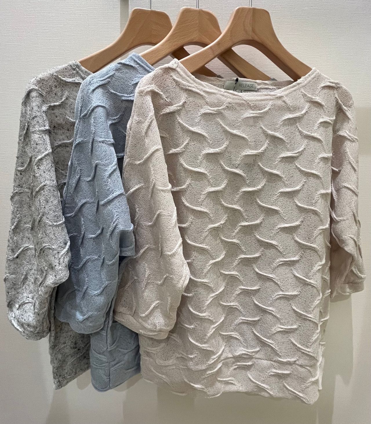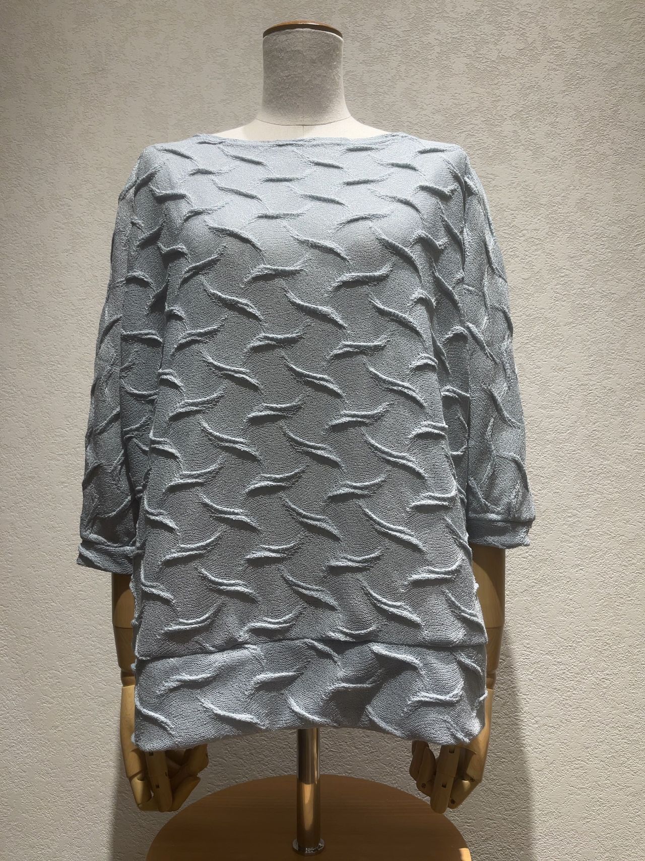 今回ご紹介させて頂くのは、ゆったりとしたドルマン袖に波模様が施されたニットソーです。