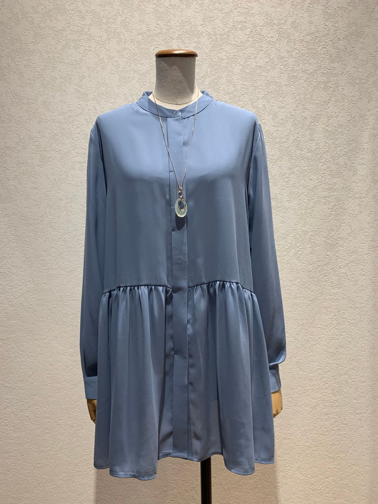 バンドカラーの綺麗目なブラウスで、長めの着丈になっています!