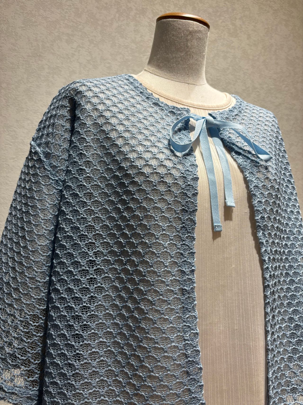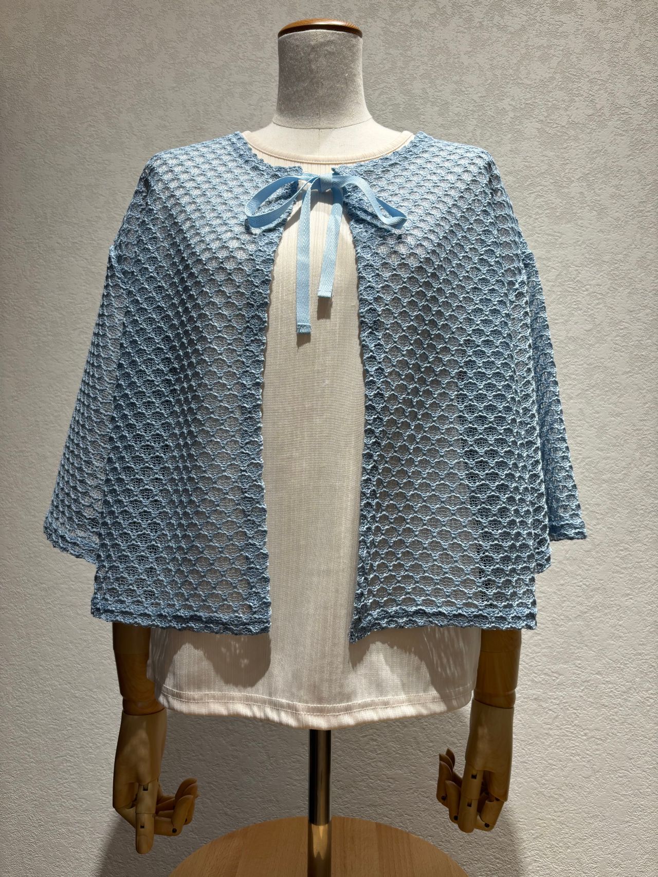 首元のリボンが可愛らしく、夏の羽織り物としてはもちろん、重ねるだけで上品でおしゃれな印象を与えてくれます。