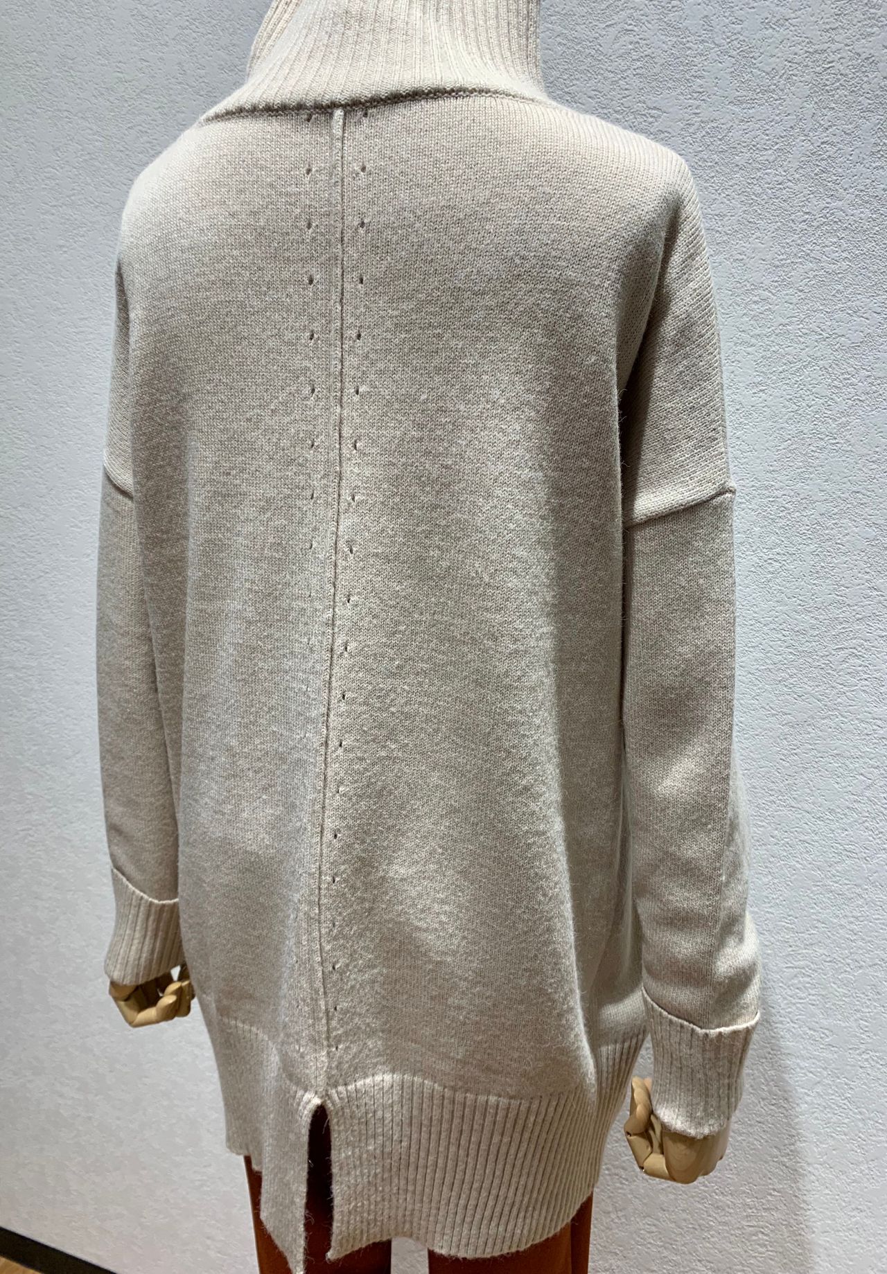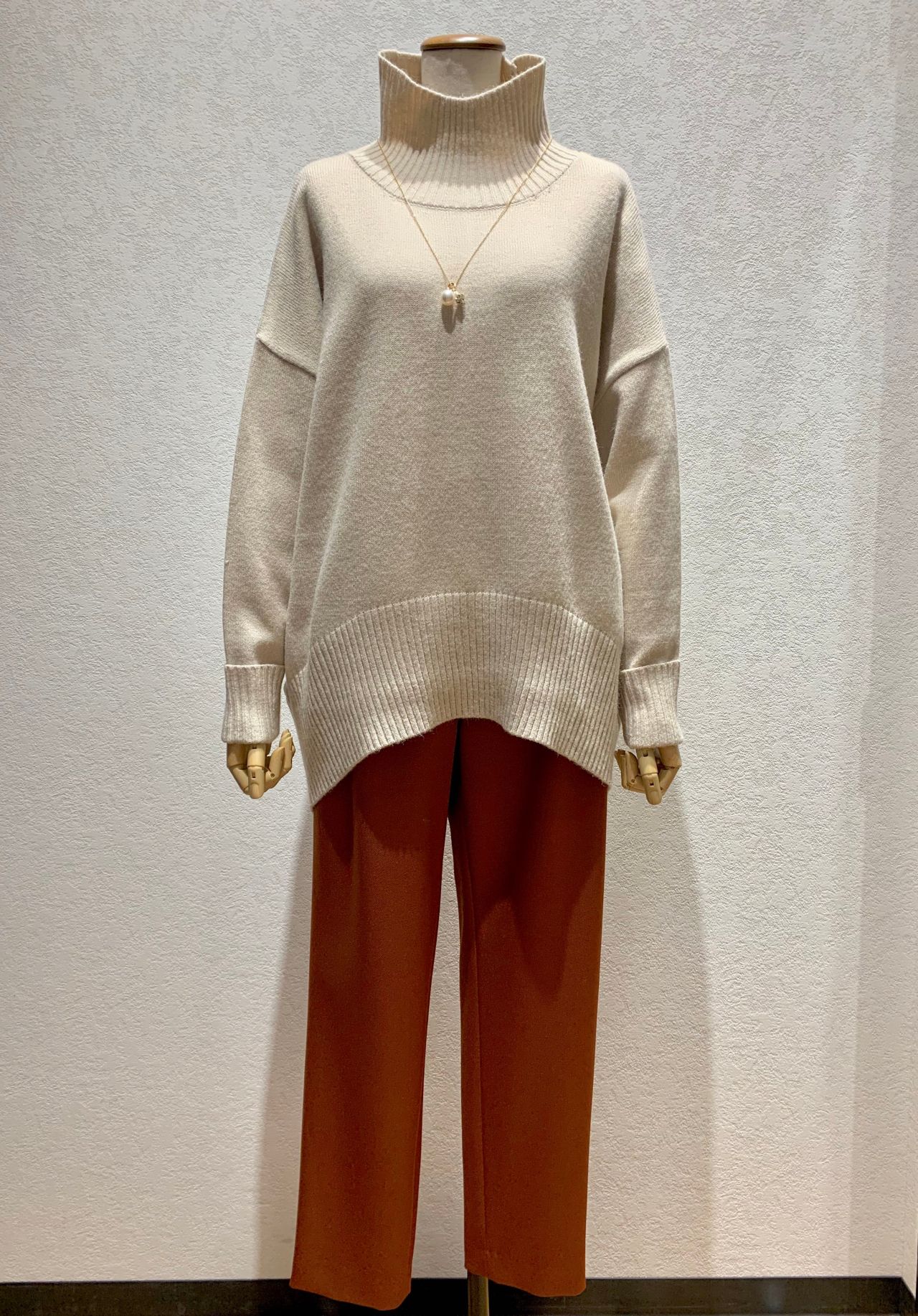 ハイネックになっているので首元も温かく、後ろが長めになっているニットです!