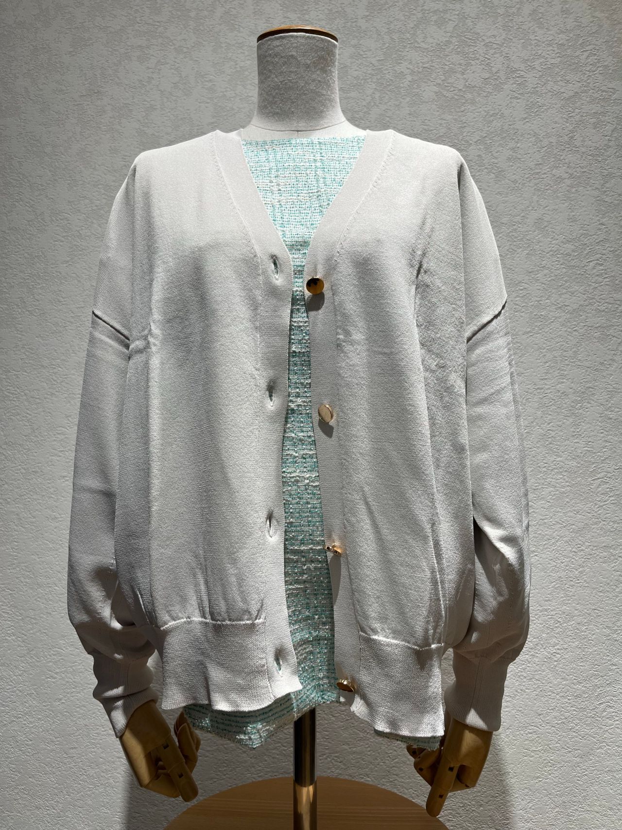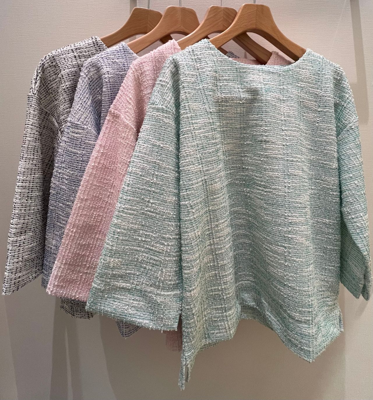全体にラメが散りばめられたツイード織の上品な素材とすっきりとした首元のデザインが女性らしい雰囲気を出してくれます。シンプルで綺麗なシルエットなので、コーディネート次第でお仕事用としても普段着としてもご着用頂けます。