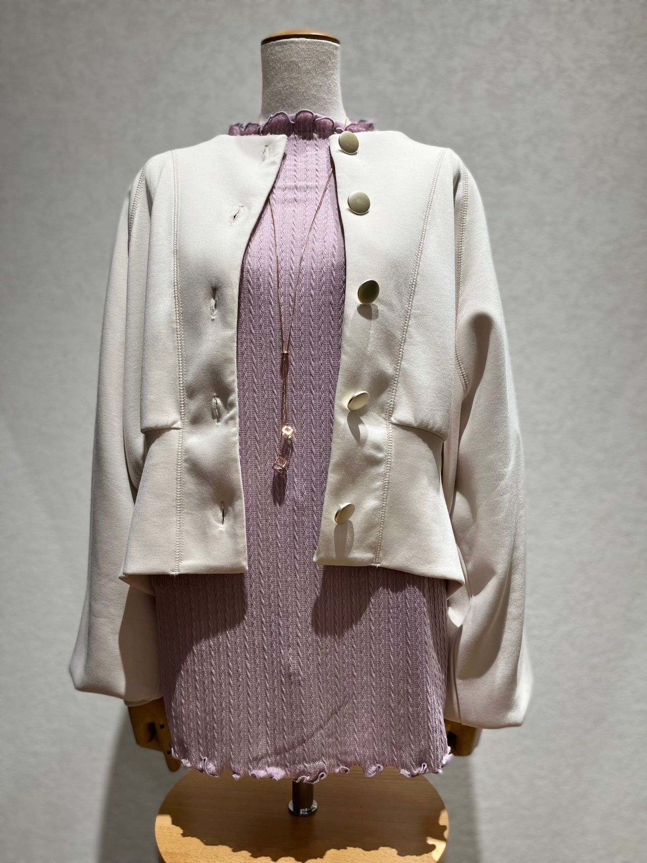 また、大きなボタンは存在感があり、ショート丈はスタイルアップにも繋がります。