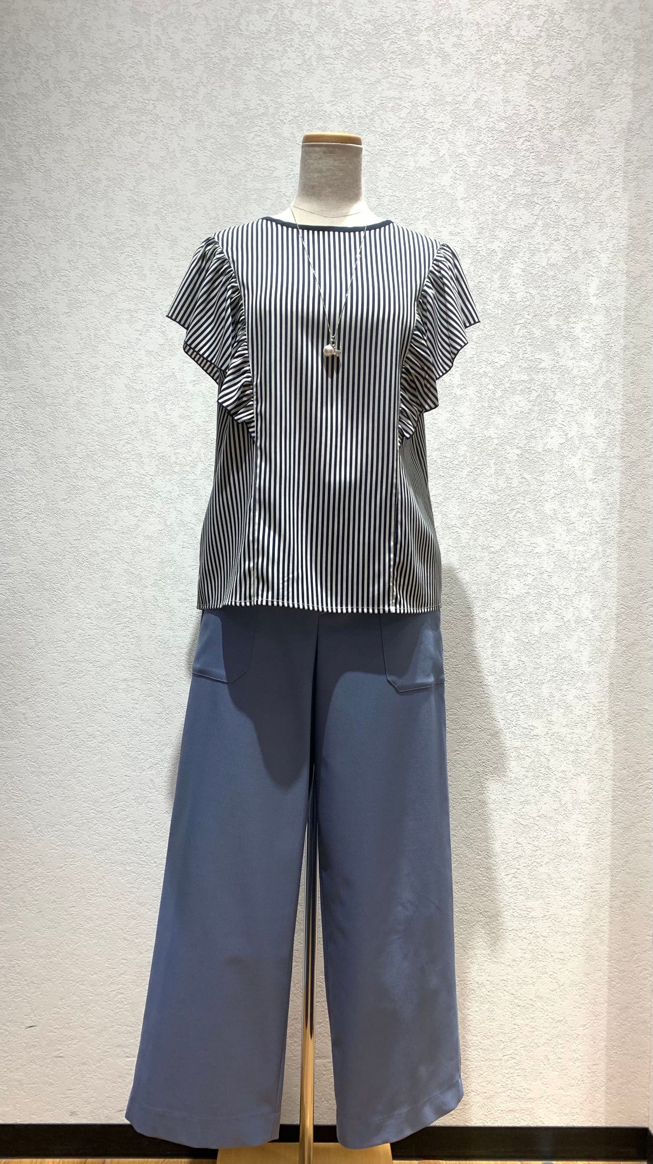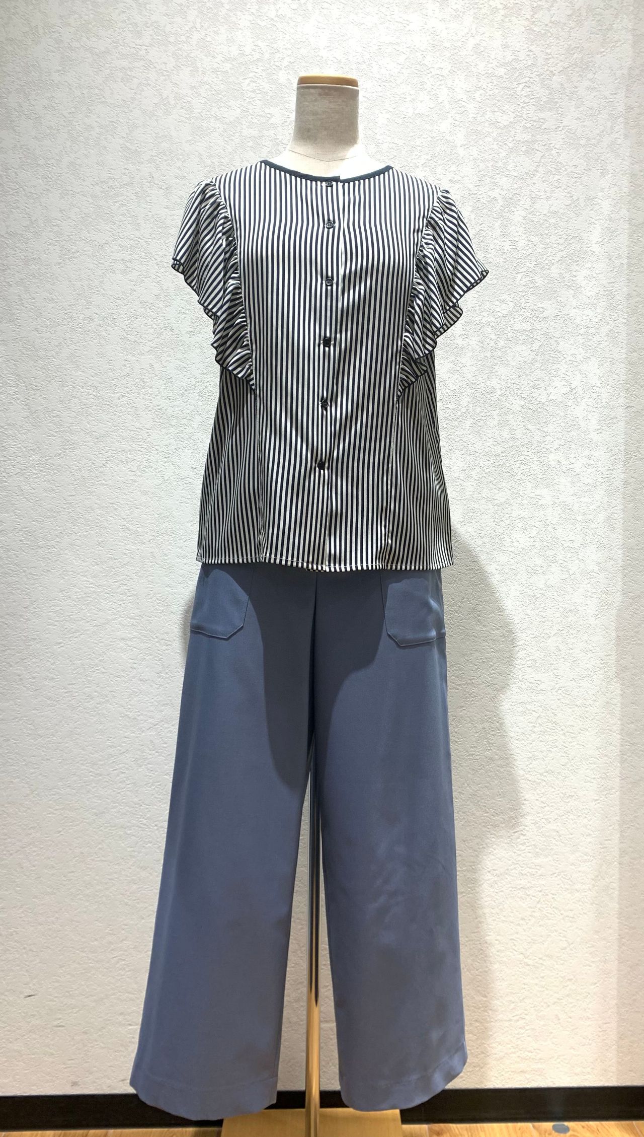ポリエステル100%でシワにもなりにくく、ストライプが涼しげな1枚です♪