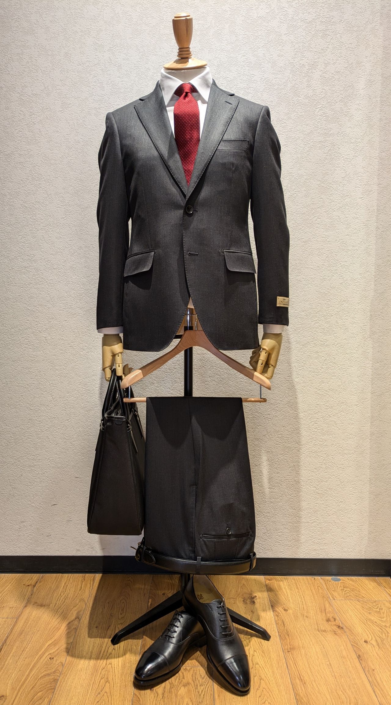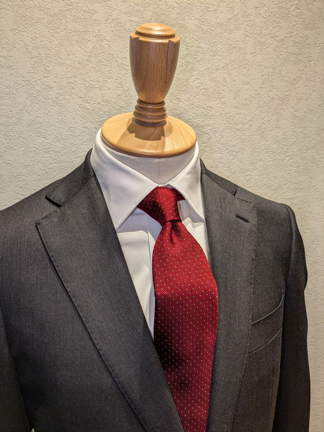 グレーのスーツには、レッド系のネクタイの相性が良いので、オススメです。