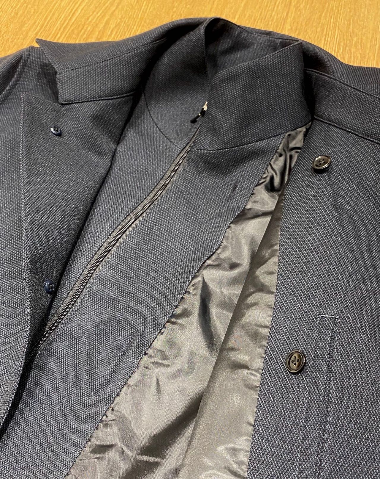 スタンドカラーで、撥水性加工を施しており、遠目から見ると無地、近くから見ると織り柄が主張し、