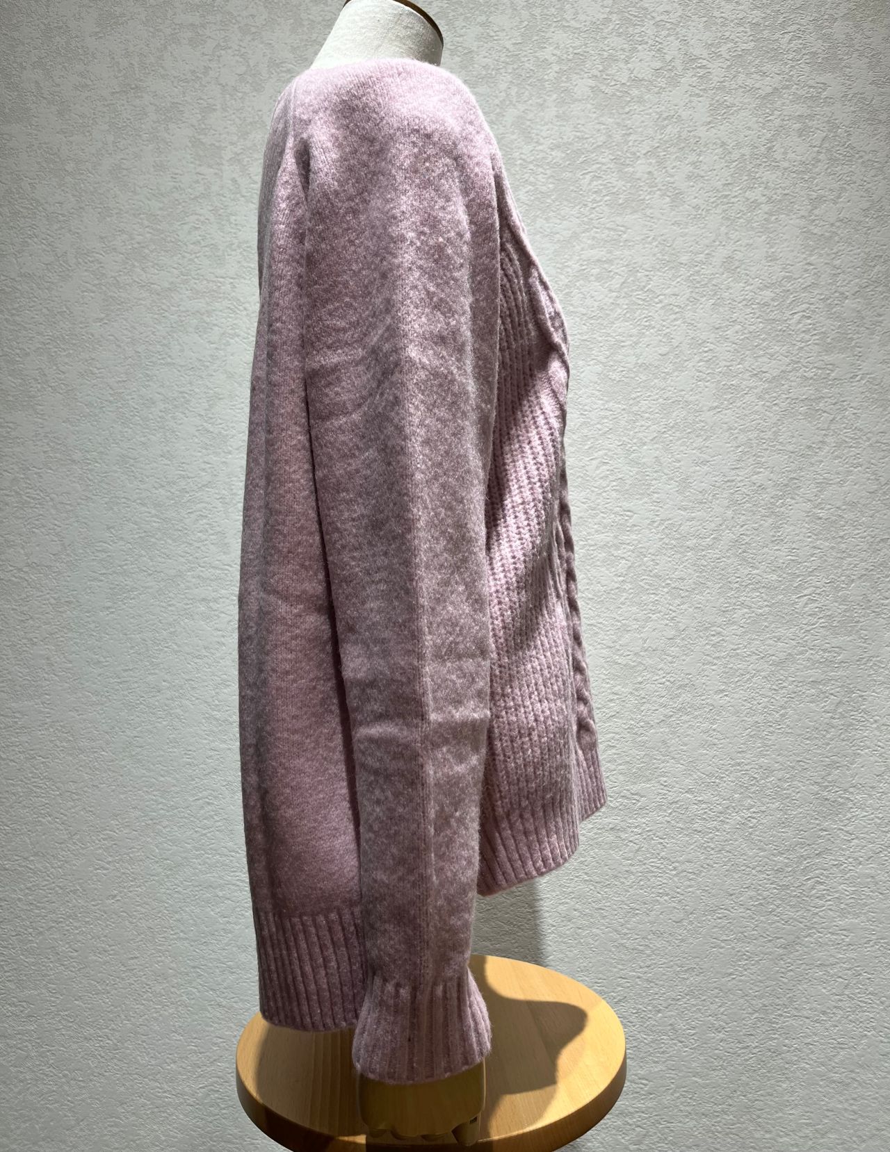 落ち着いた色のアウターを選びがちになる季節ですが、淡い色のニットなので差し色でもお使いいただけます!