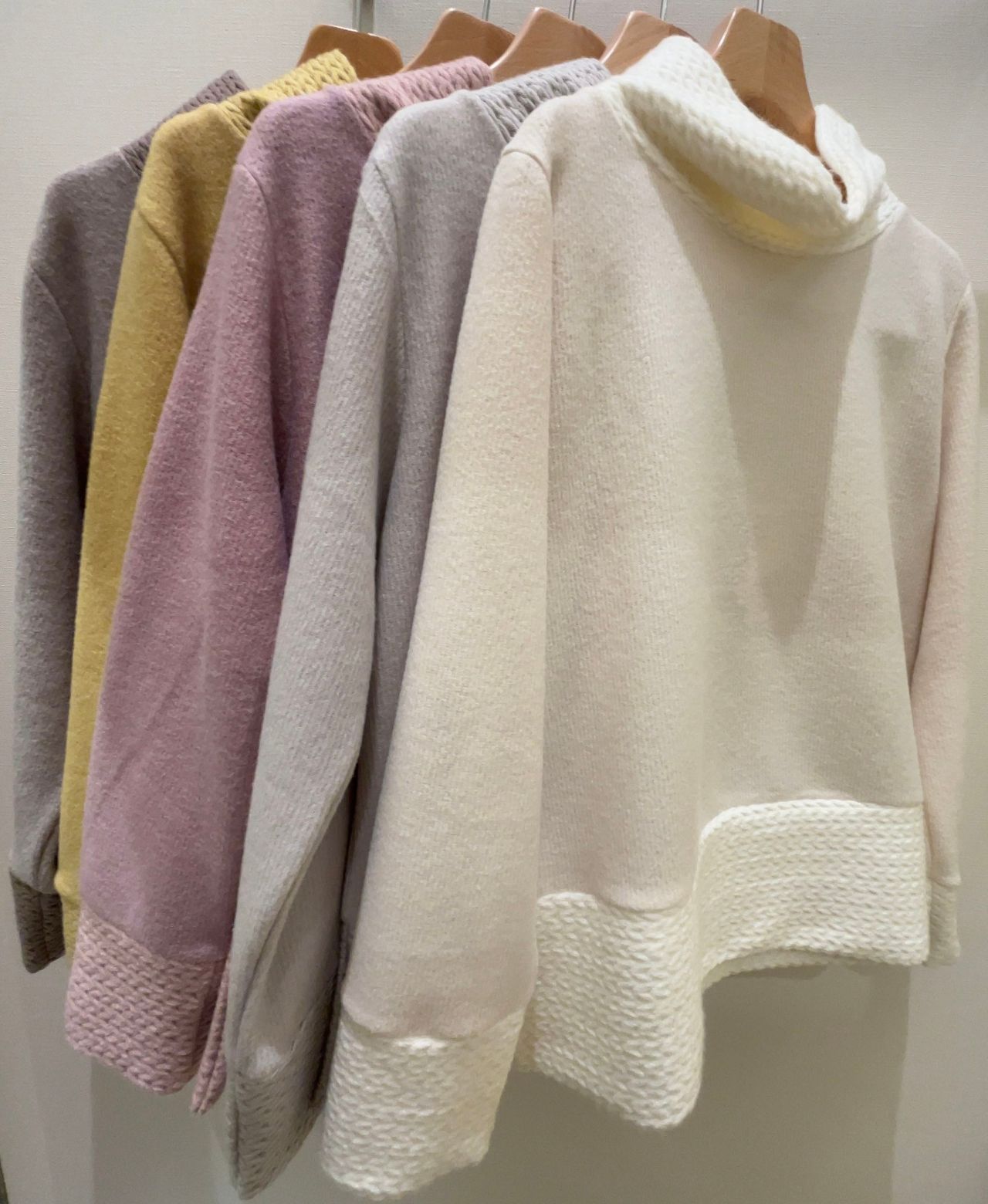 暖かみのある三つ編み風のケーブル編みとオフタートルネックが組み合わさって柔らく女性らしい雰囲気を出してくれます。色のバリエーションも多く、冬の装いがパッと明るくなる色展開となっております。