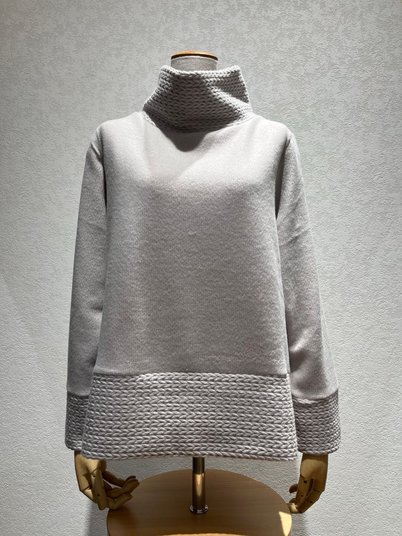 今回ご紹介させて頂くのは、今の季節にぴったりなケーブル編みが施されたオフタートルのカットソーです。