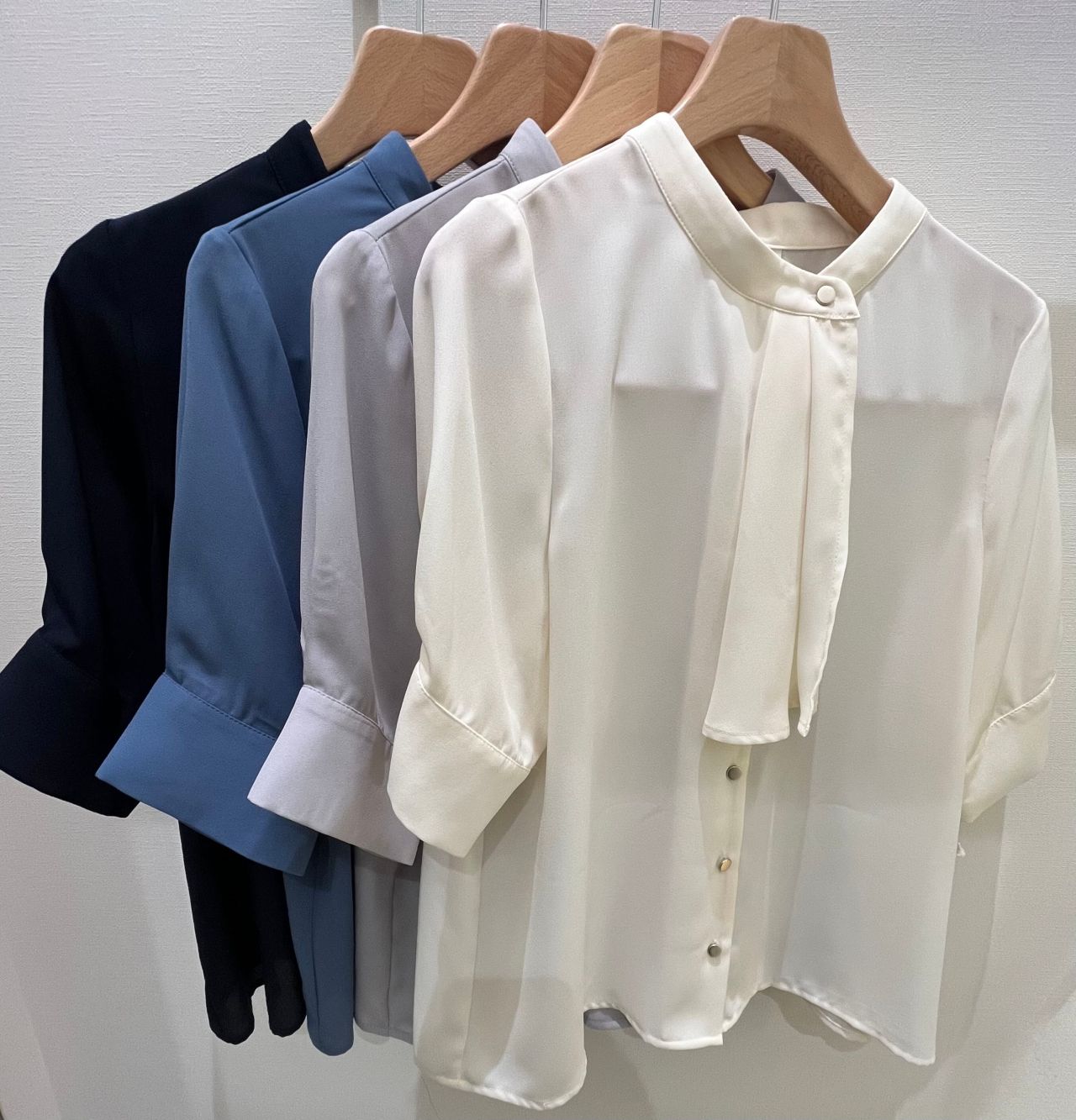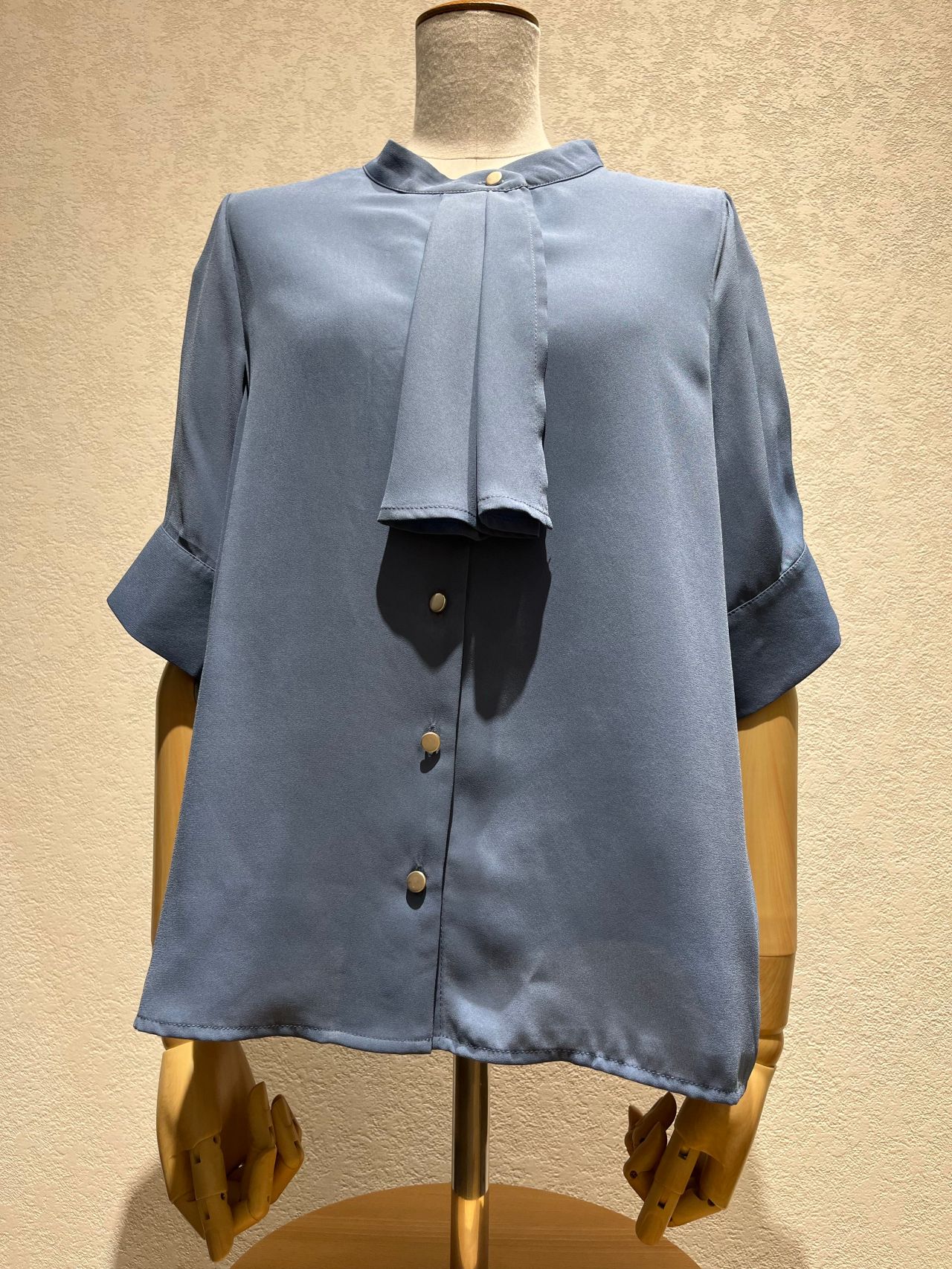 本日、ご紹介させて頂くのはボータイ風のデザインが特徴的なジョーゼットブラウスです。