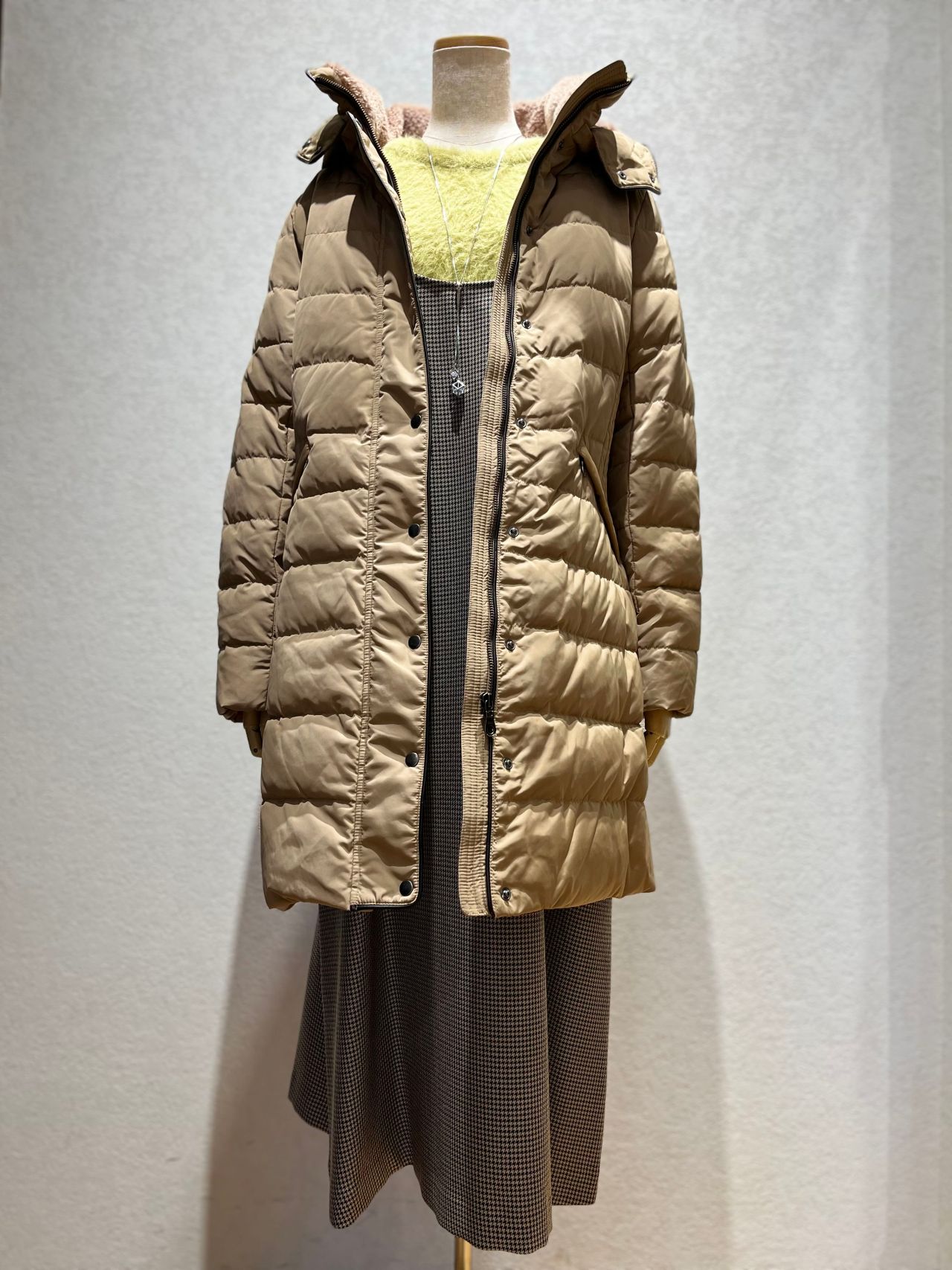 首元が二重に分かれたシンプルなシルエットに脇下の縦のラインが強調されて着ぶくれ感なくご着用頂けます。
