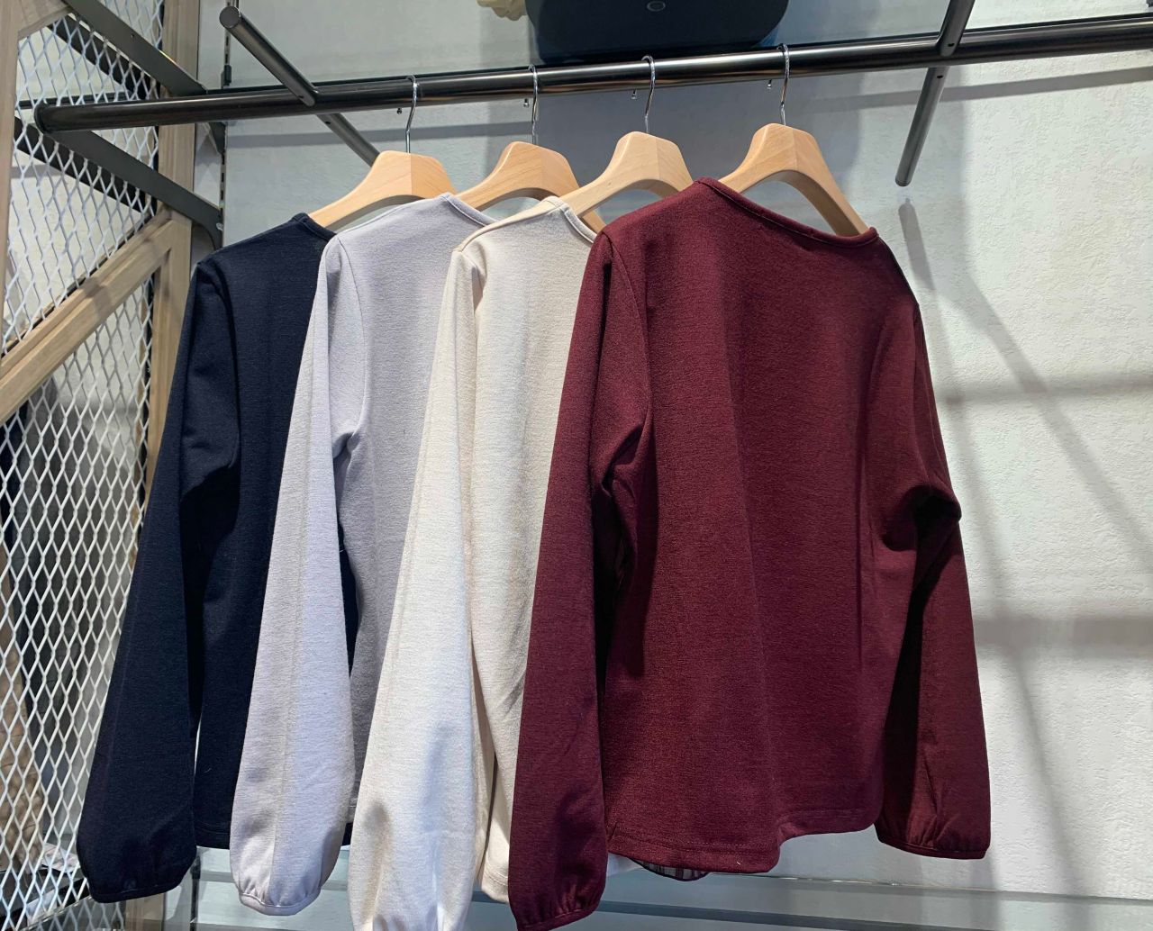 襟元の開きも広くないので1枚でとても着やすく、後ろ見頃は無地のカットソー素材ですが、羽織って頂ければブラウス見えもします♪