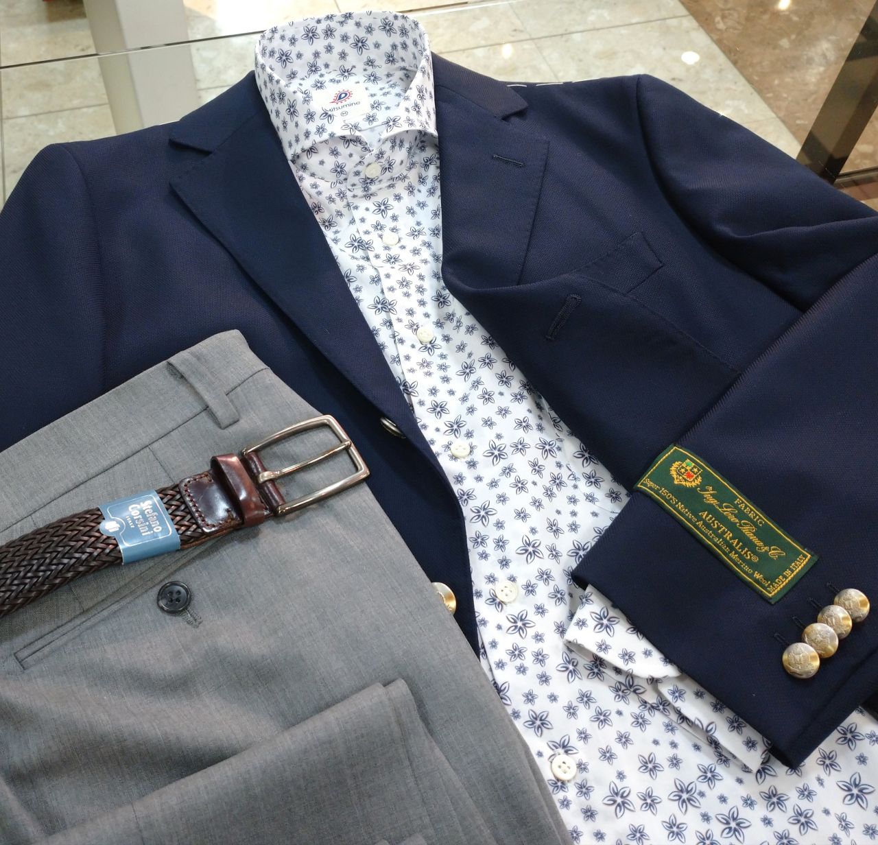ネイビーのブレザーと、ライトグレーのスラックスで
