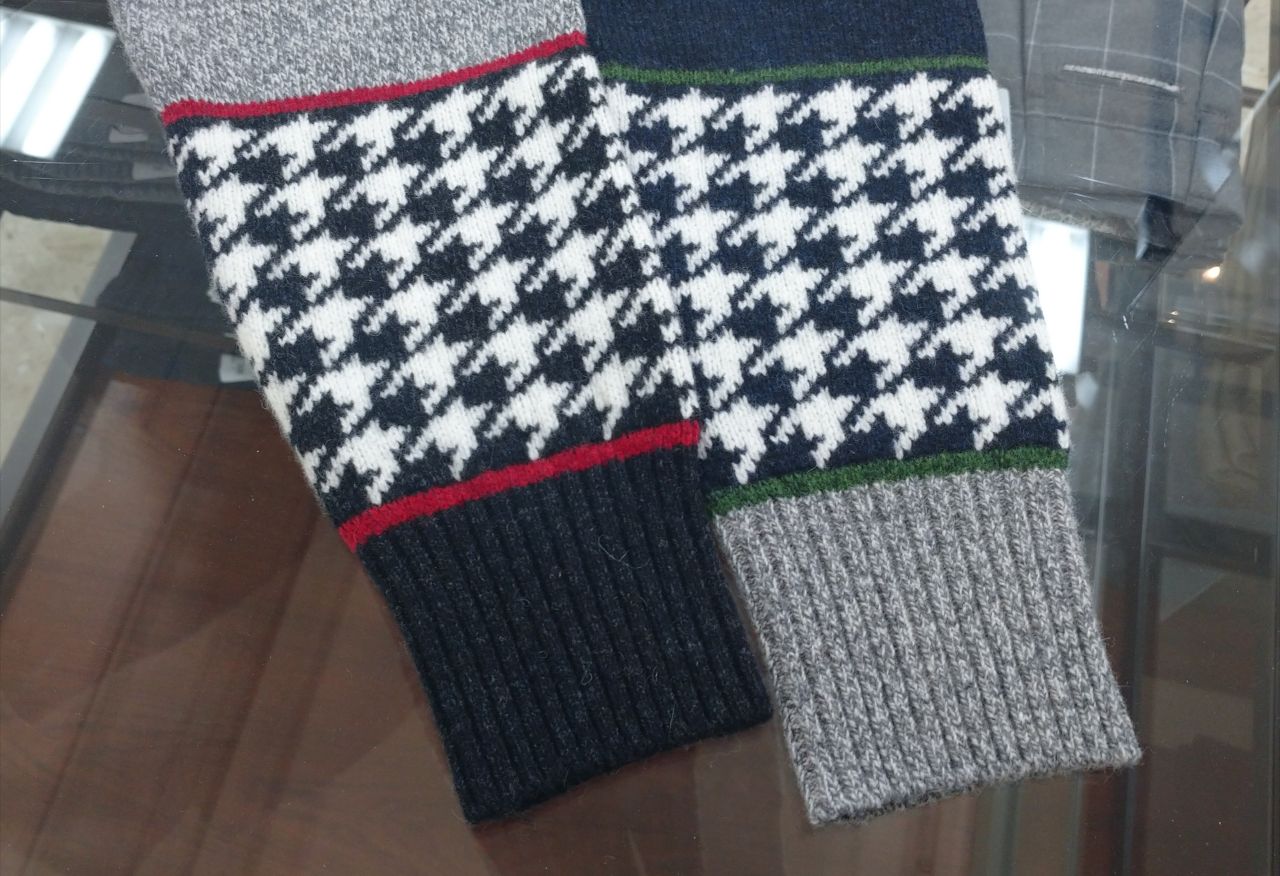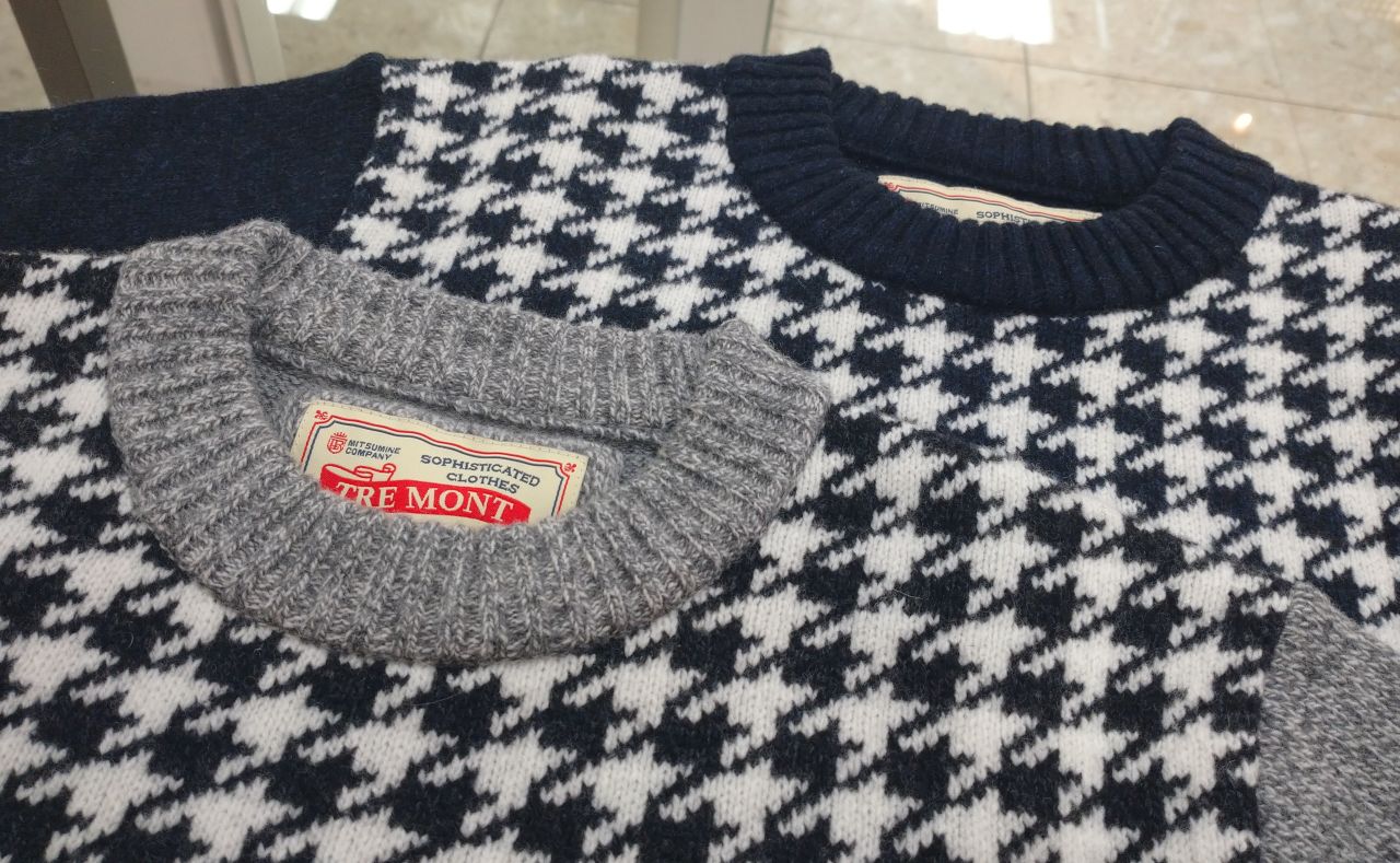 袖と前身の一部が千鳥柄で切替えられた、デザイン性の高いニットです。